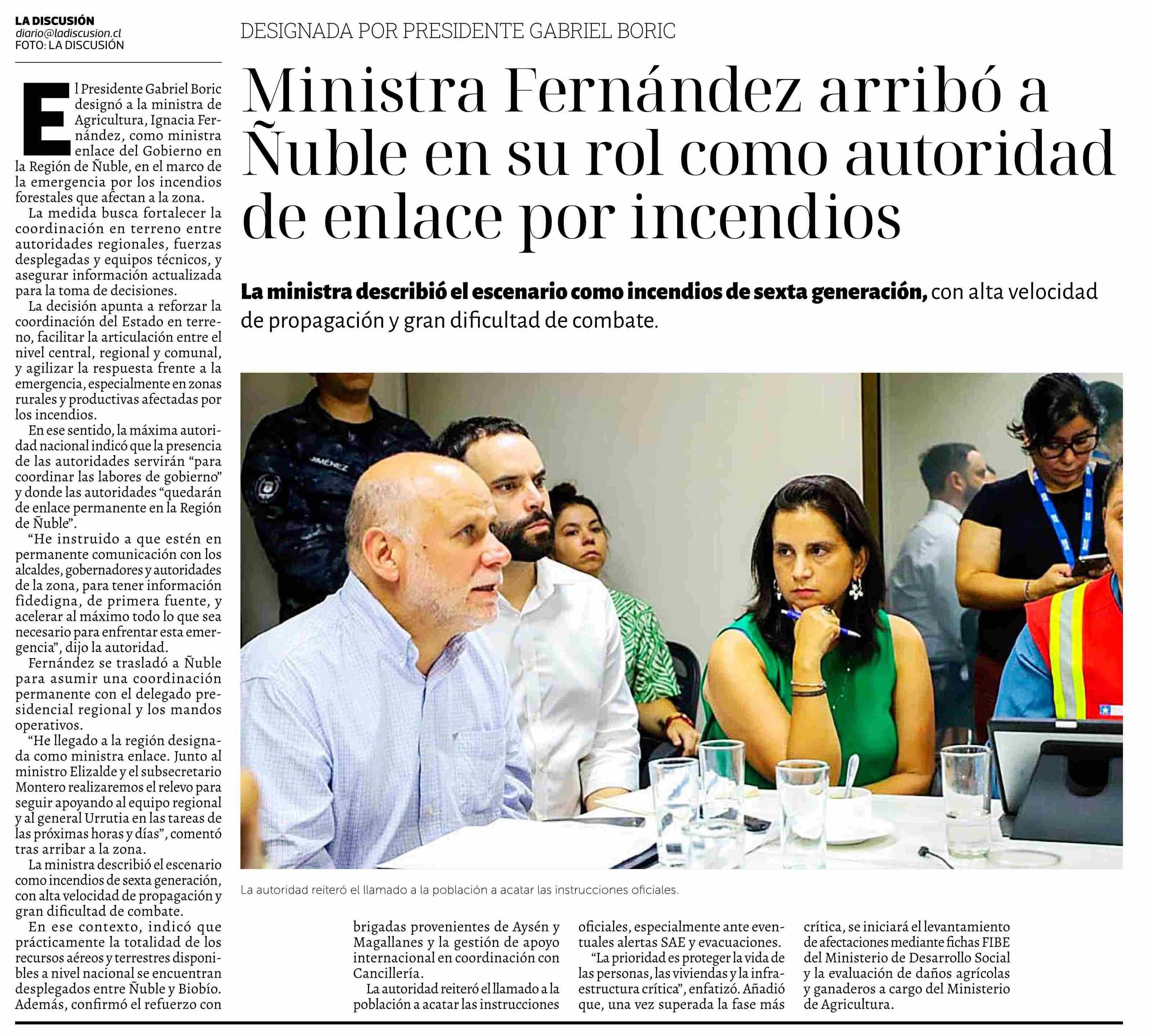 Ministra Fernández arribó a Ñuble en su rol como autoridad de enlace por incendios