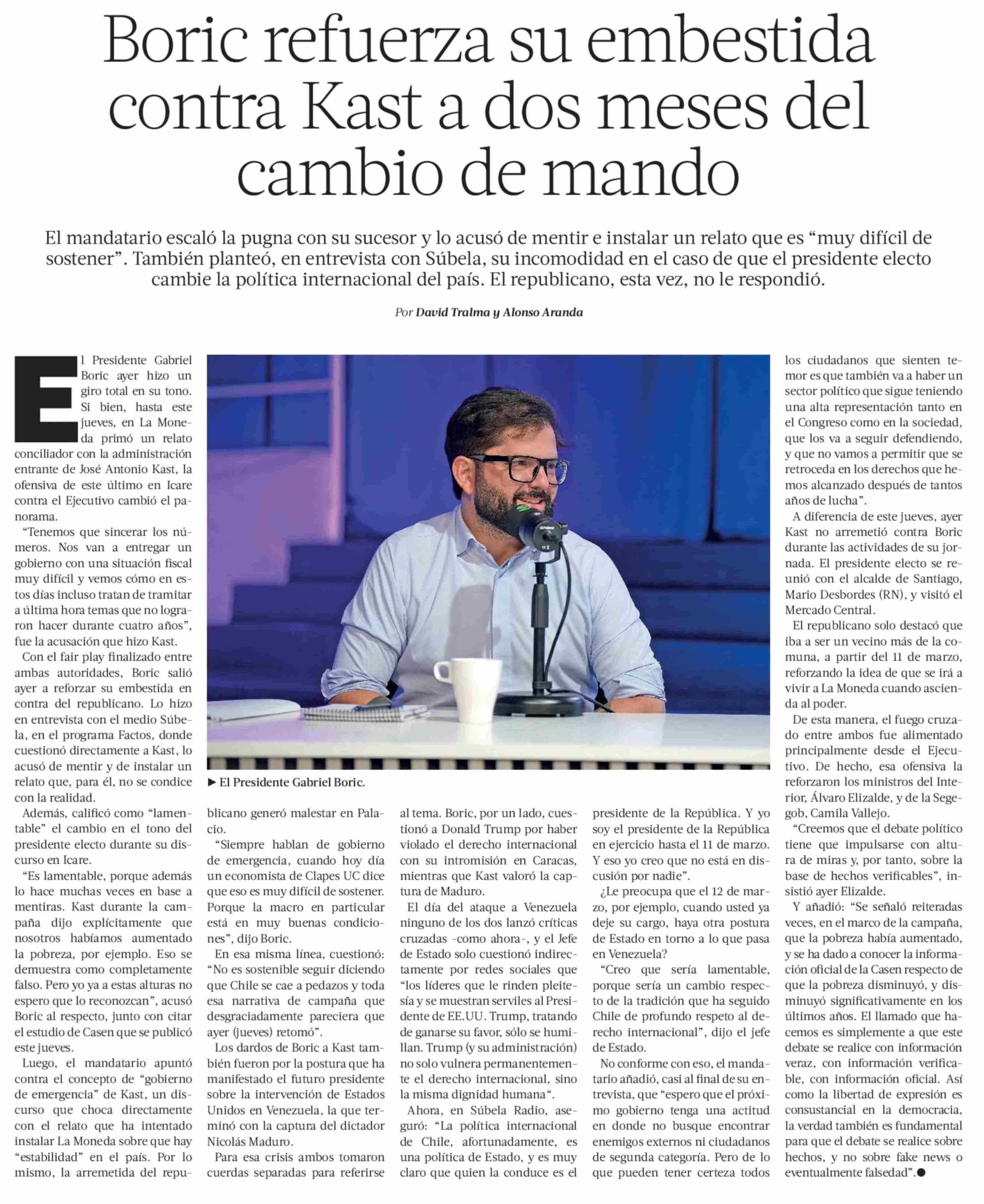 Boric refuerza su embestida contra Kast a dos meses del cambio de mando