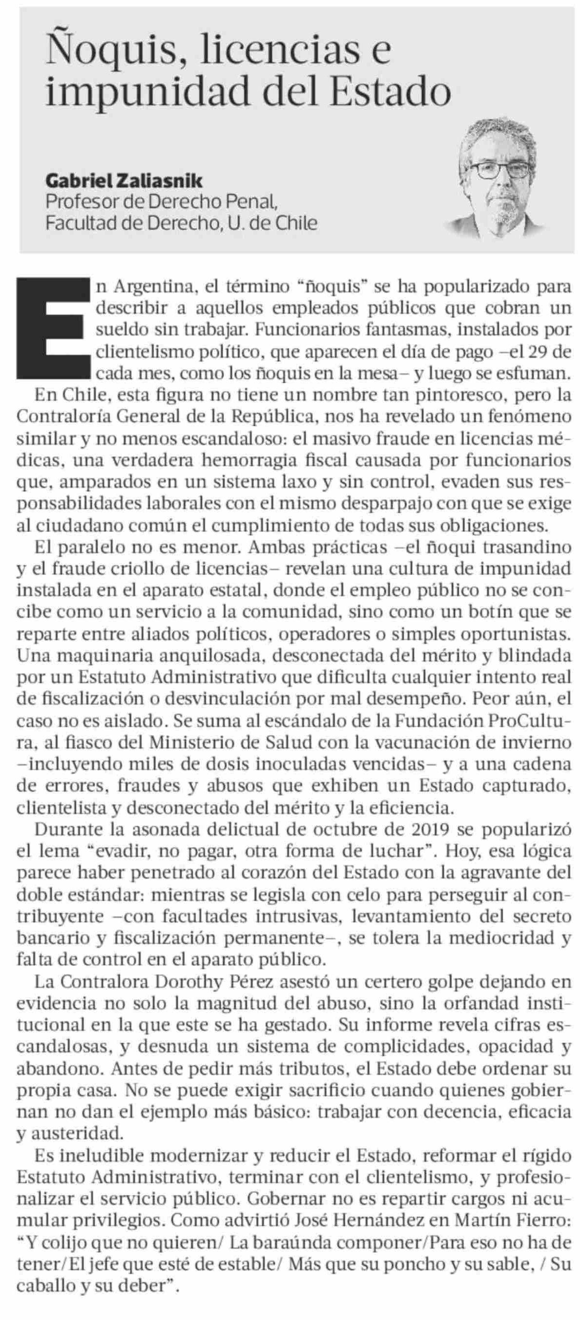 Columnas de Opinión: Ñoquis, licencias e impunidad del Estado