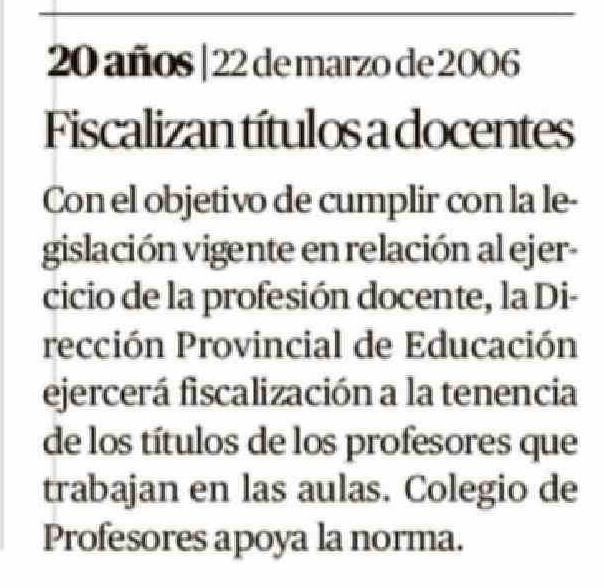 | Título: | Con el objetivo de cumplir con la legislación vigente en relación al ejercicio de la profesión docente, la Dirección Provincial de Educación ejercerá fiscalización a la tenencia de los títulos de los profesores que trabajan en las aulas. Colegio de Profesores apoya la norma. |