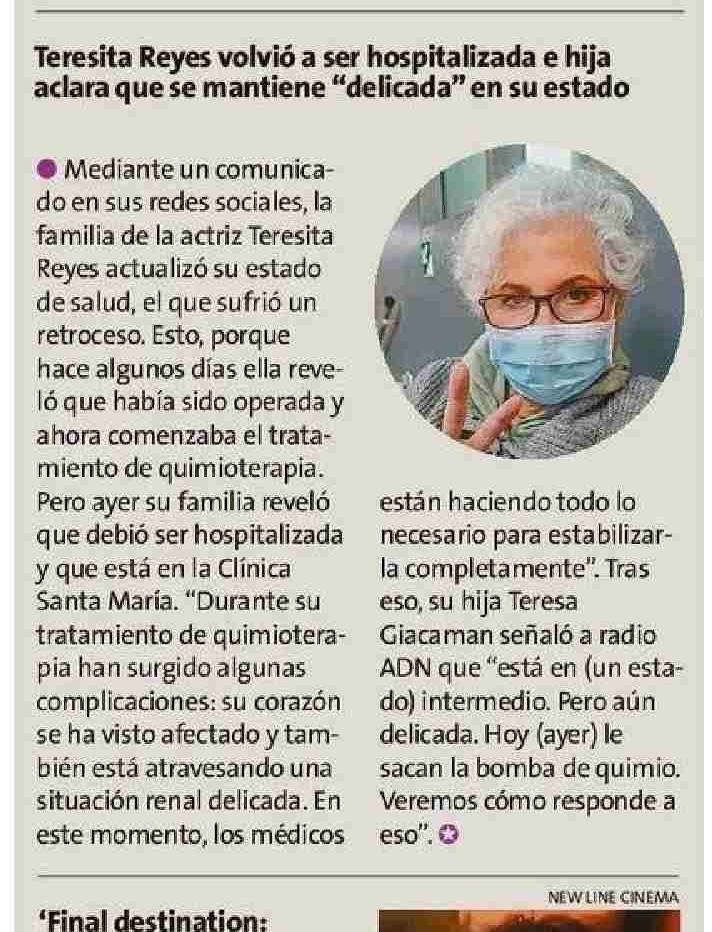 Teresita Reyes volvió a ser hospitalizada e hija aclara que se mantiene “delicada” en su estado
