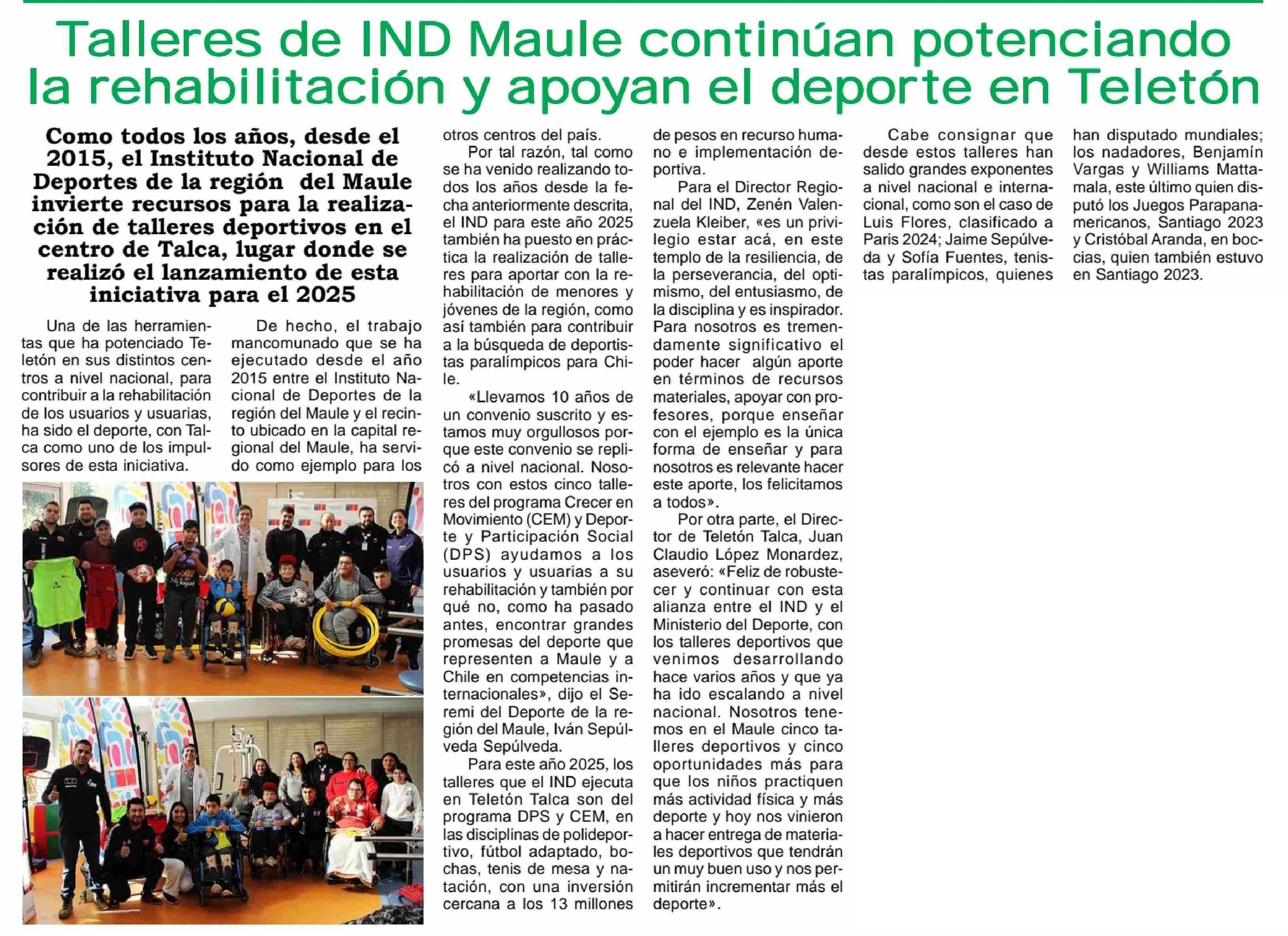 Talleres de IND Maule continúan potenciando la rehabilitación y apoyan el deporte en Teletón