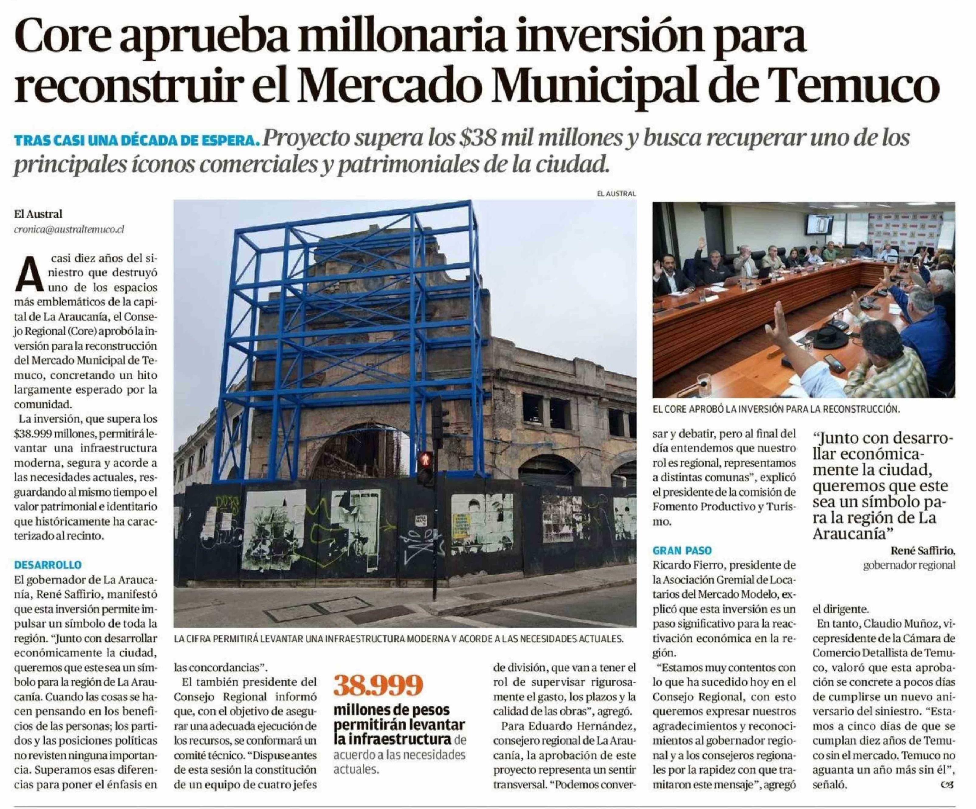 Core aprueba millonaria inversión para reconstruir el Mercado Municipal de Temuco