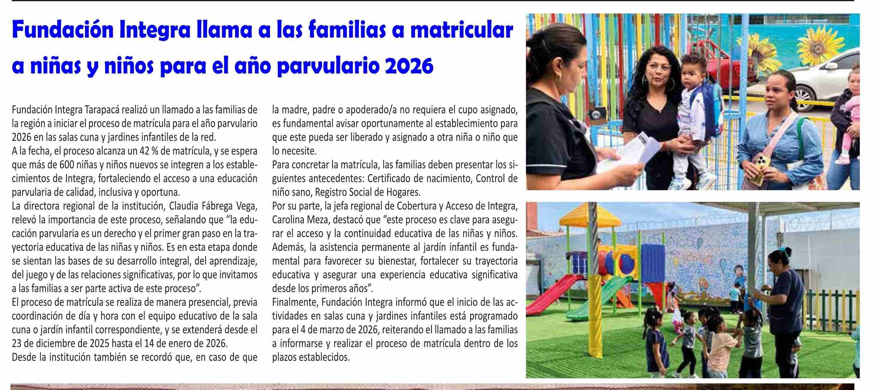 Fundación Integra llama a las familias a matricular a niñas y niños para el año parvulario 2026
