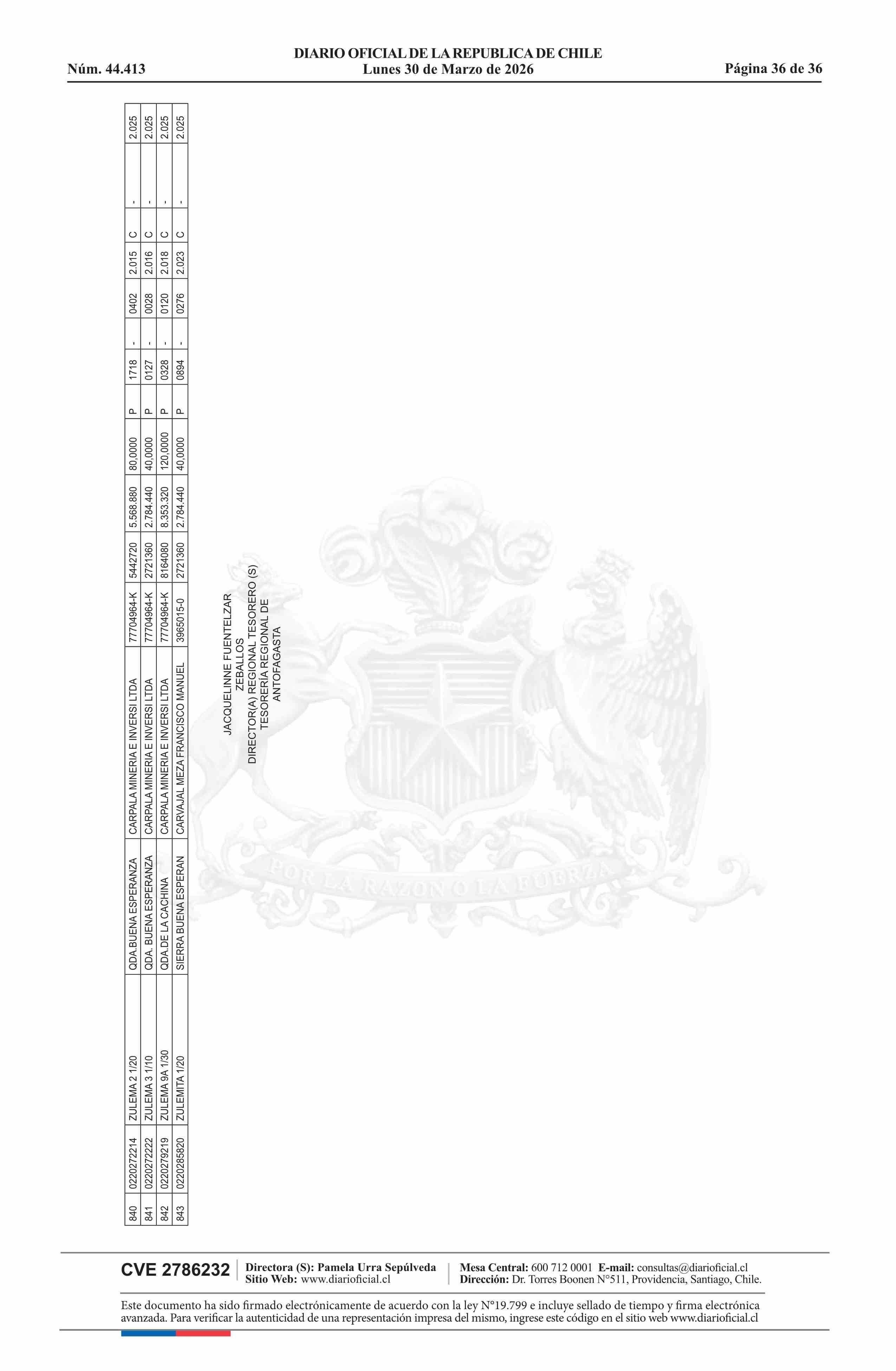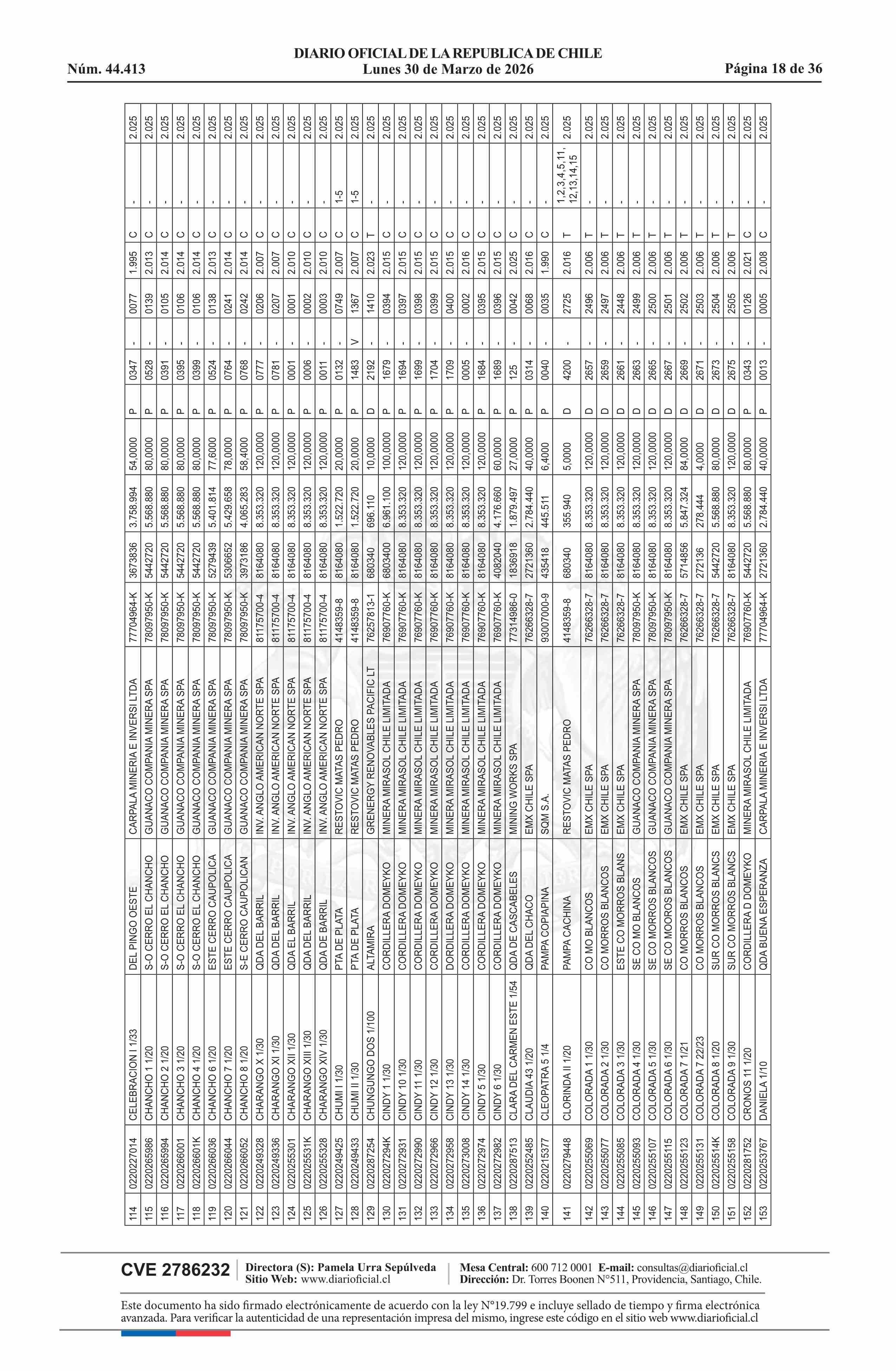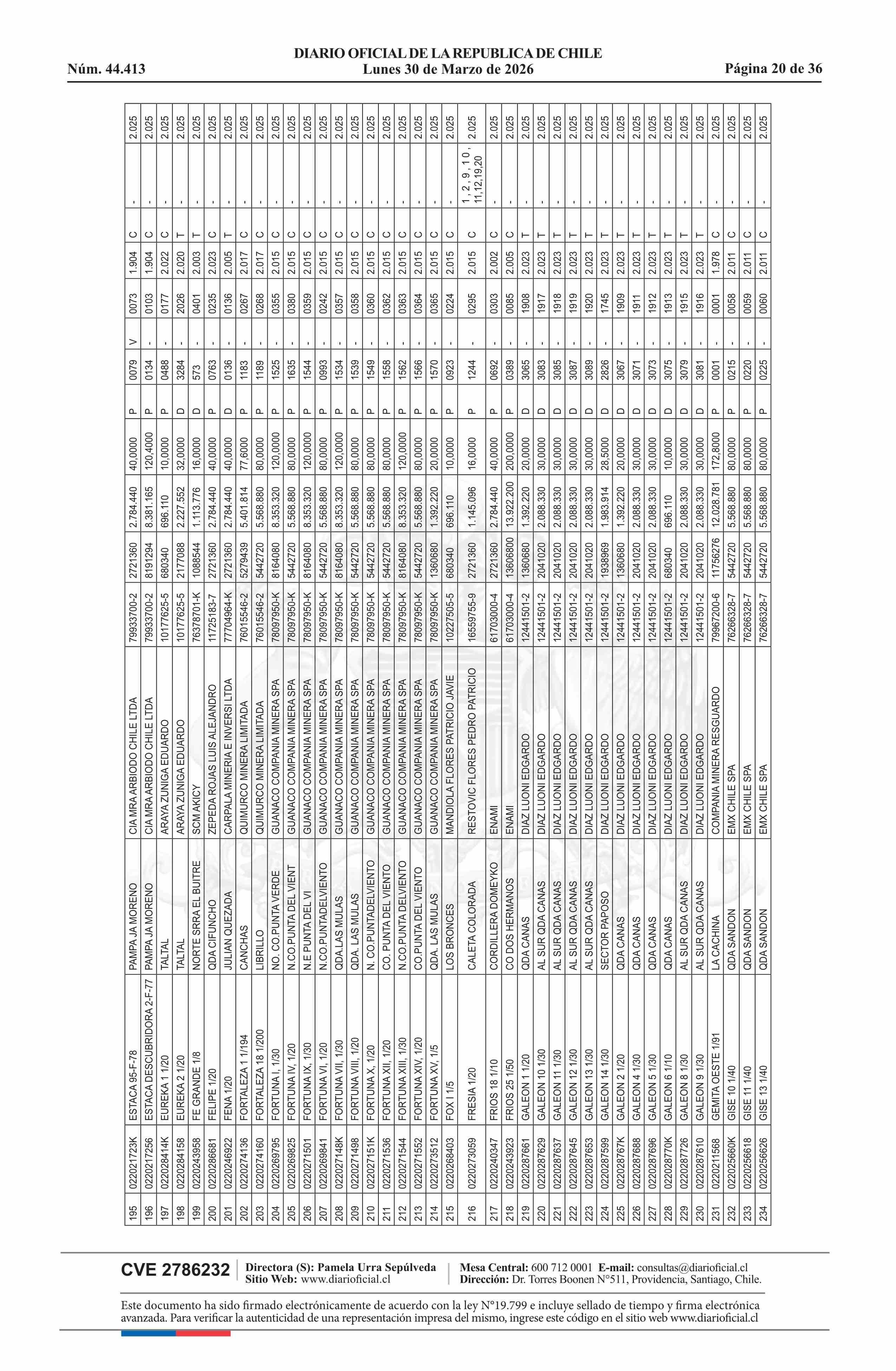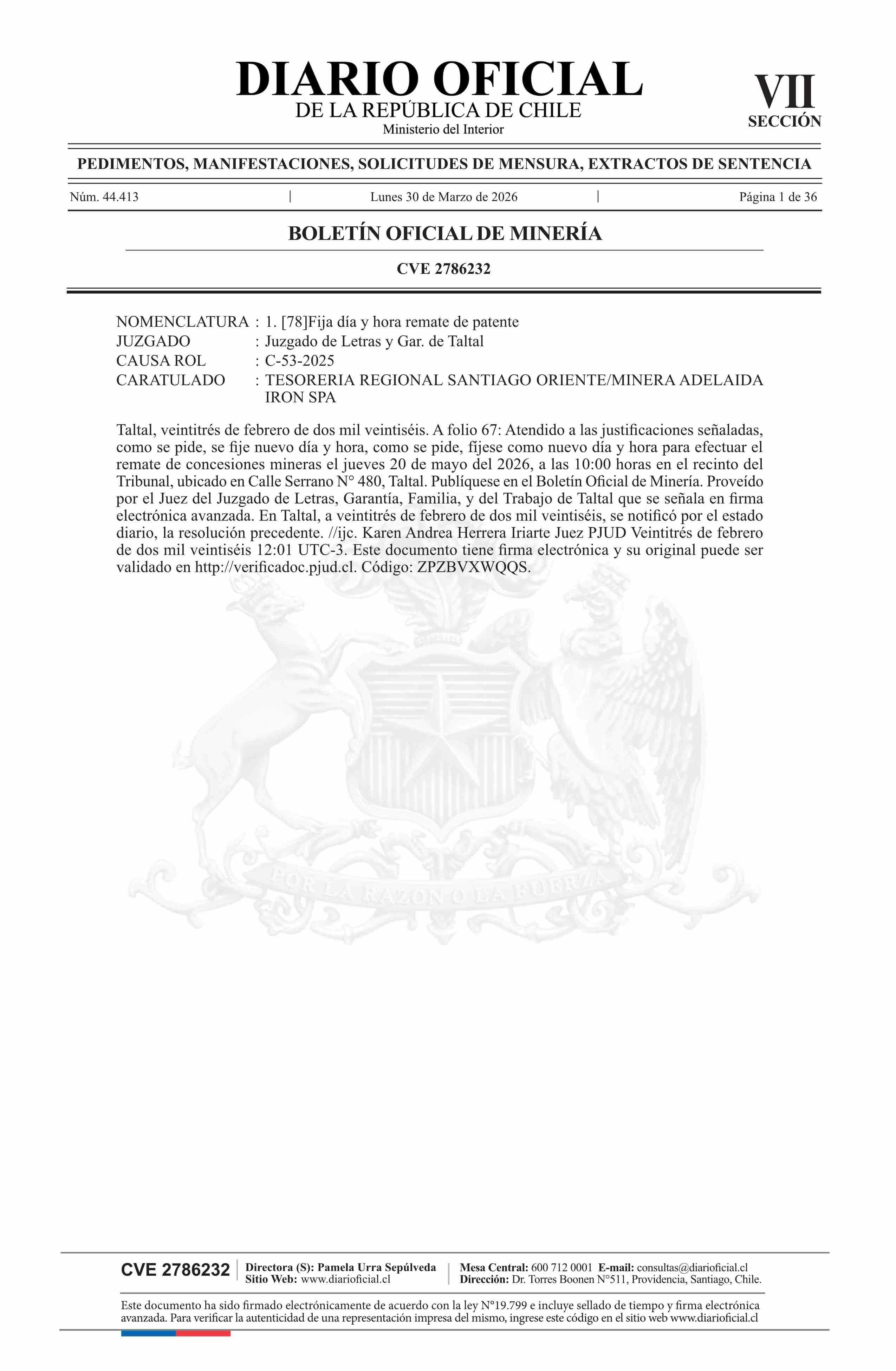 | Fuente: | DIARIO OFICIAL CHILE - BOLETÍN OFICIAL DE MINERÍA (DIARIO OFICIAL CHILE – BOM – NÓMINA REMATE) | Página(s): | 54-89 |