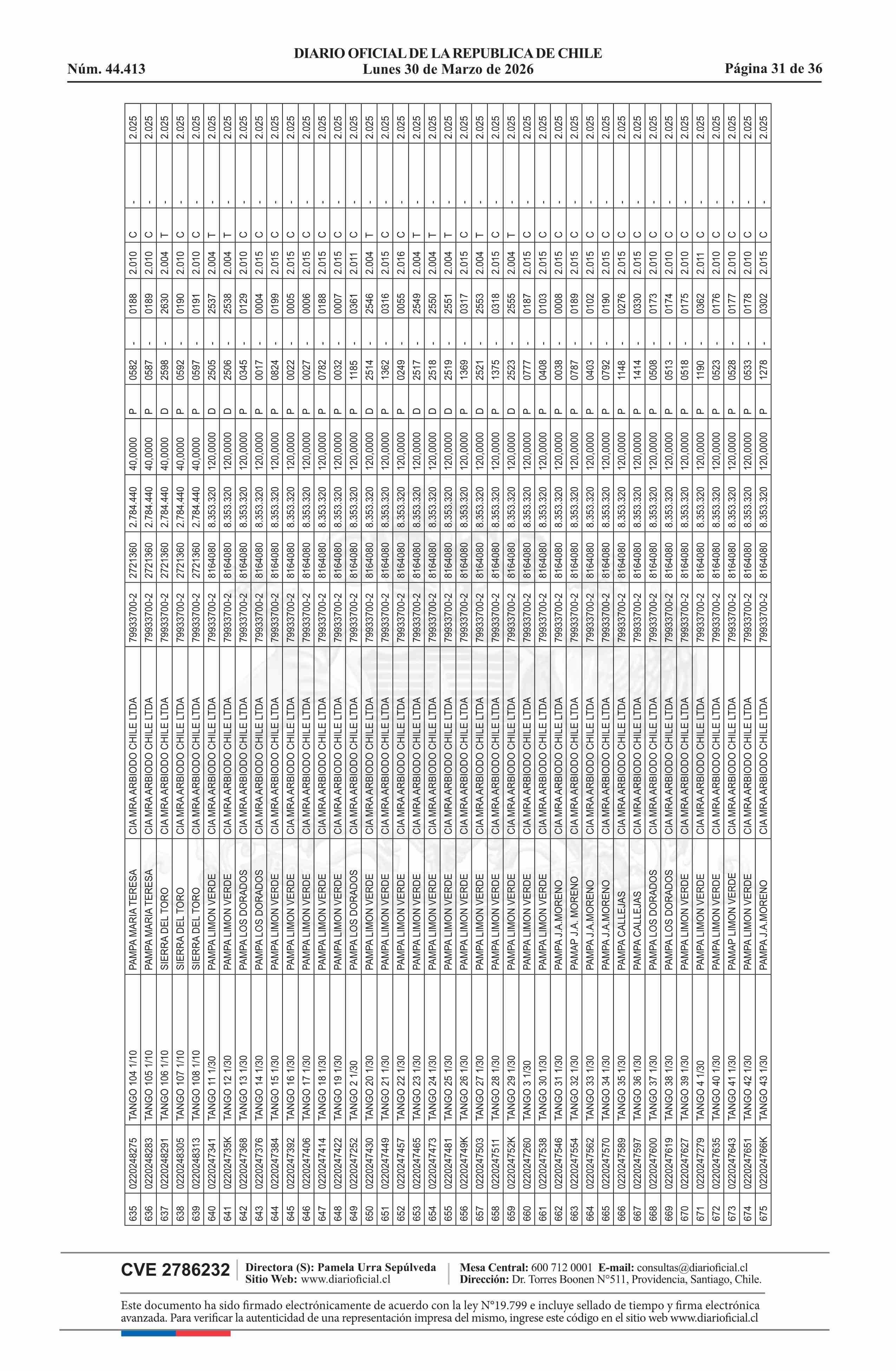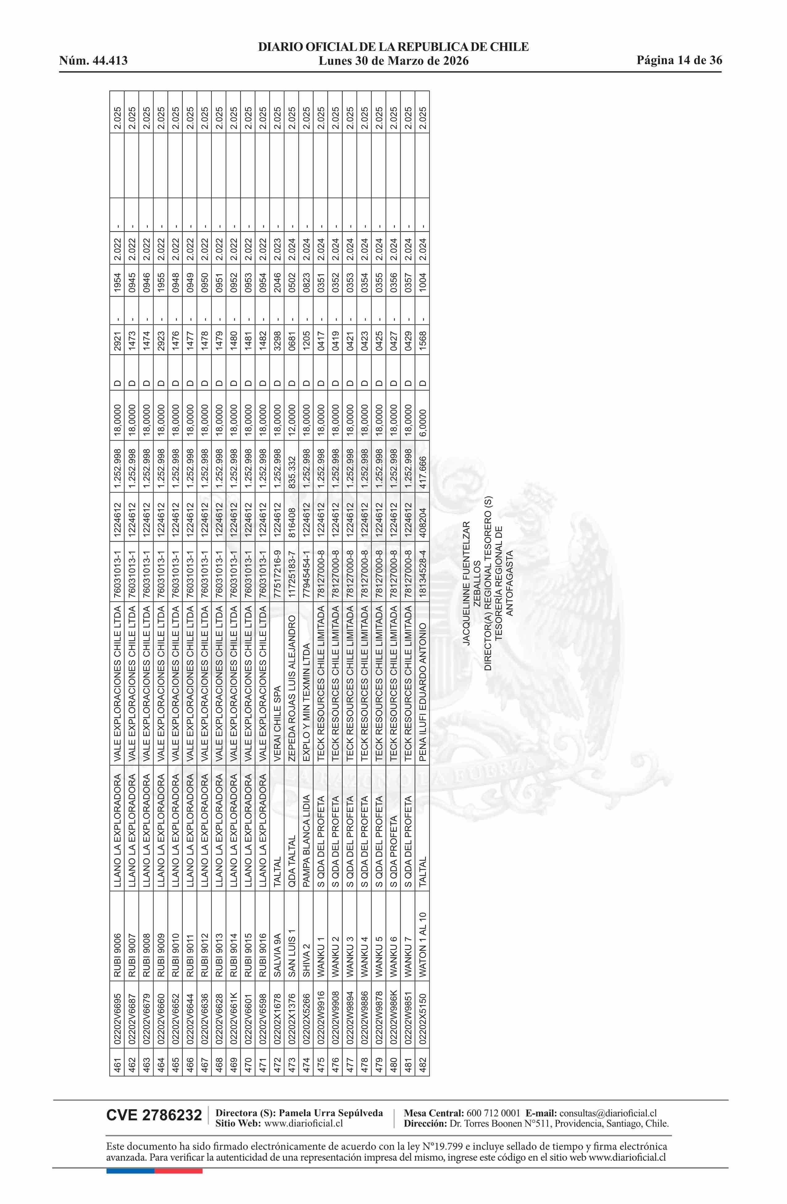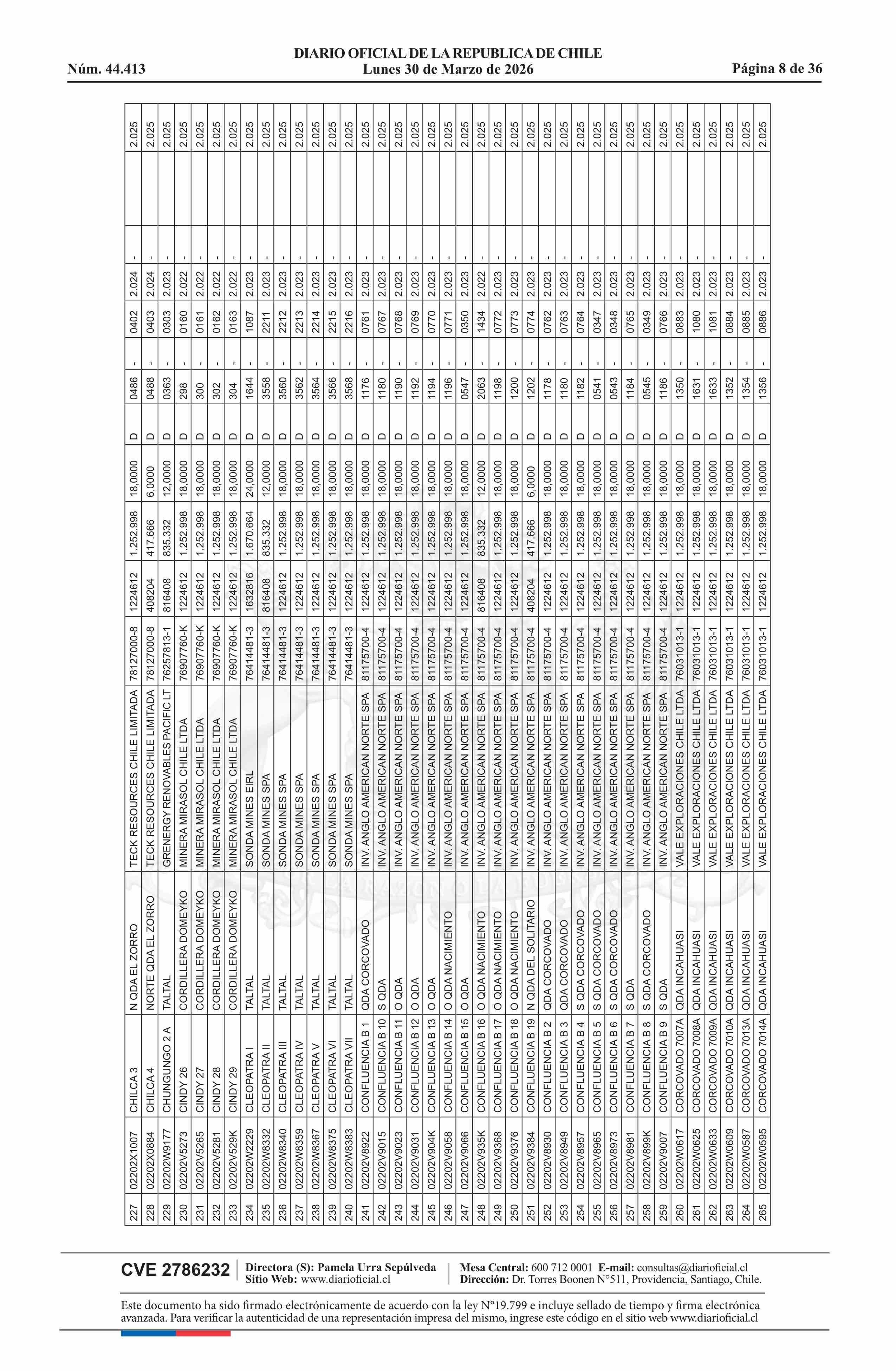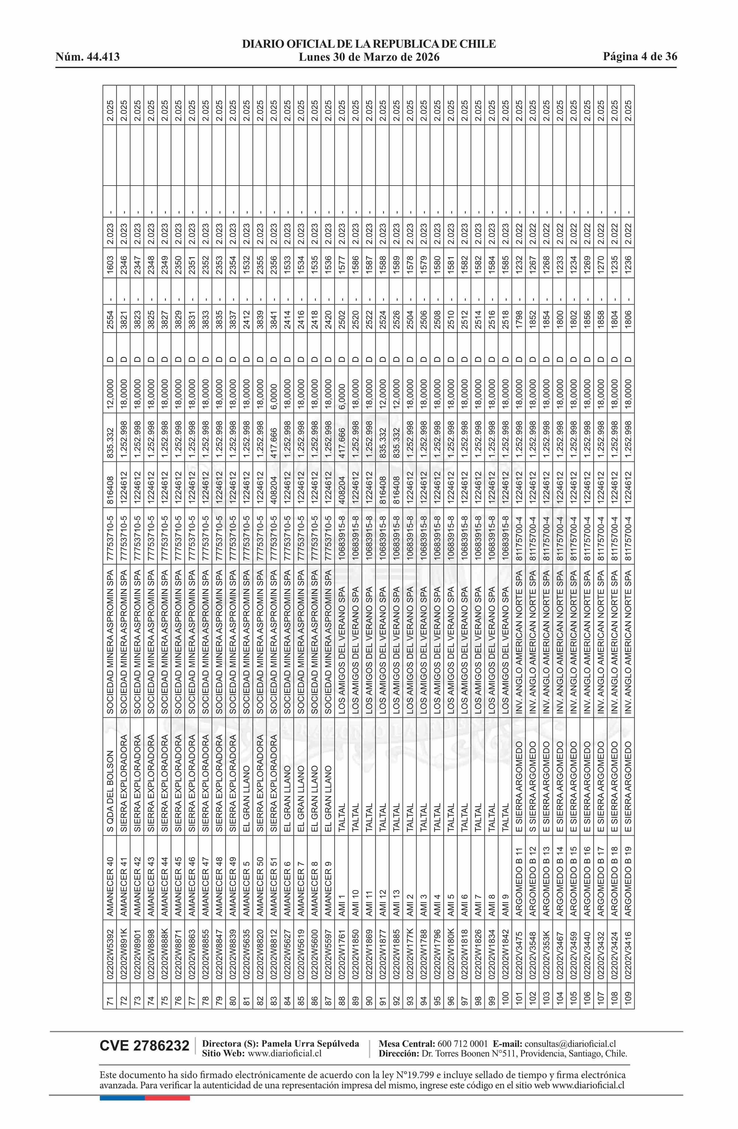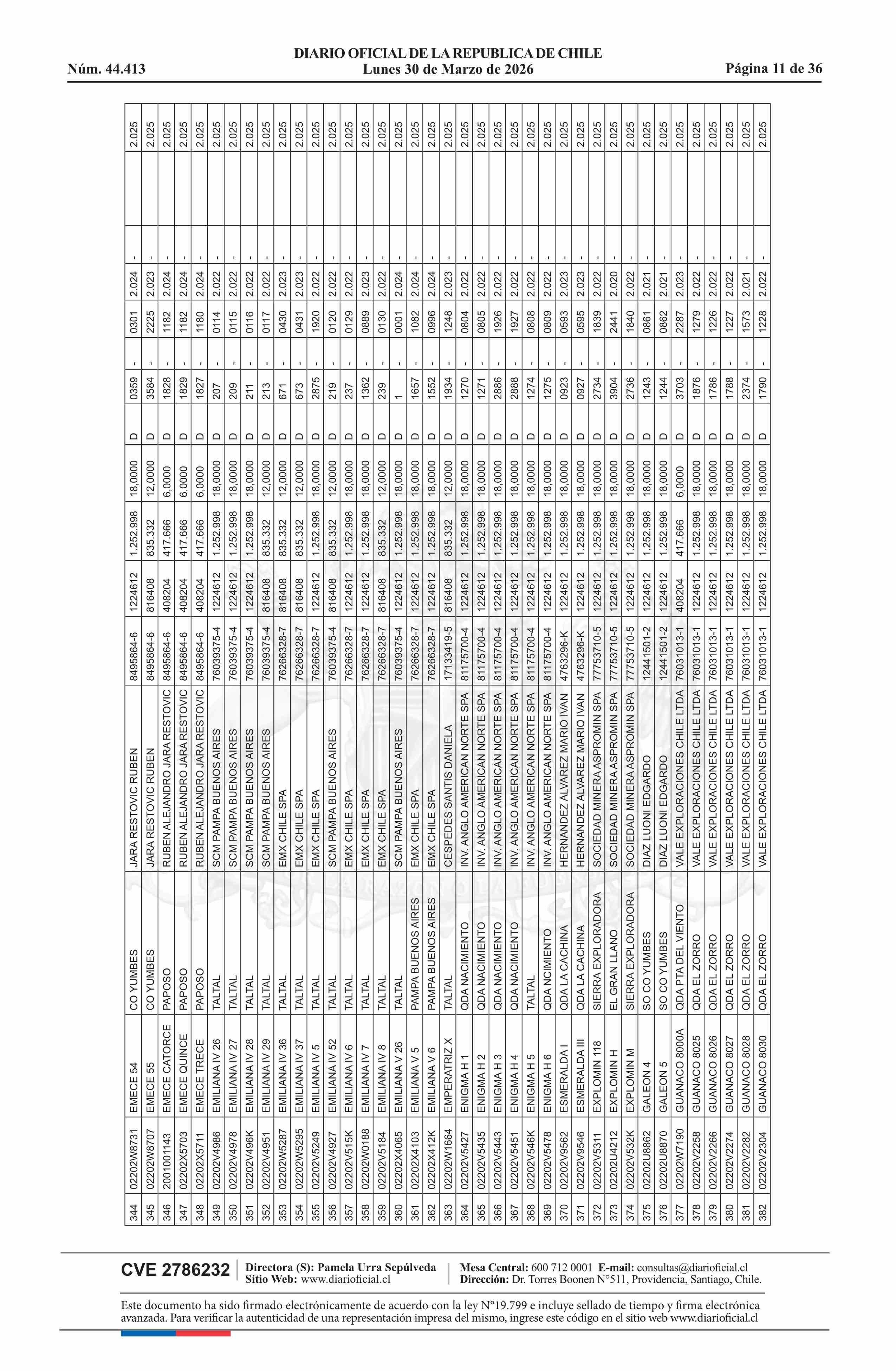 | Fuente: | DIARIO OFICIAL CHILE - BOLETÍN OFICIAL DE MINERÍA (DIARIO OFICIAL CHILE – BOM – NÓMINA REMATE) | Página(s): | 54-89 |