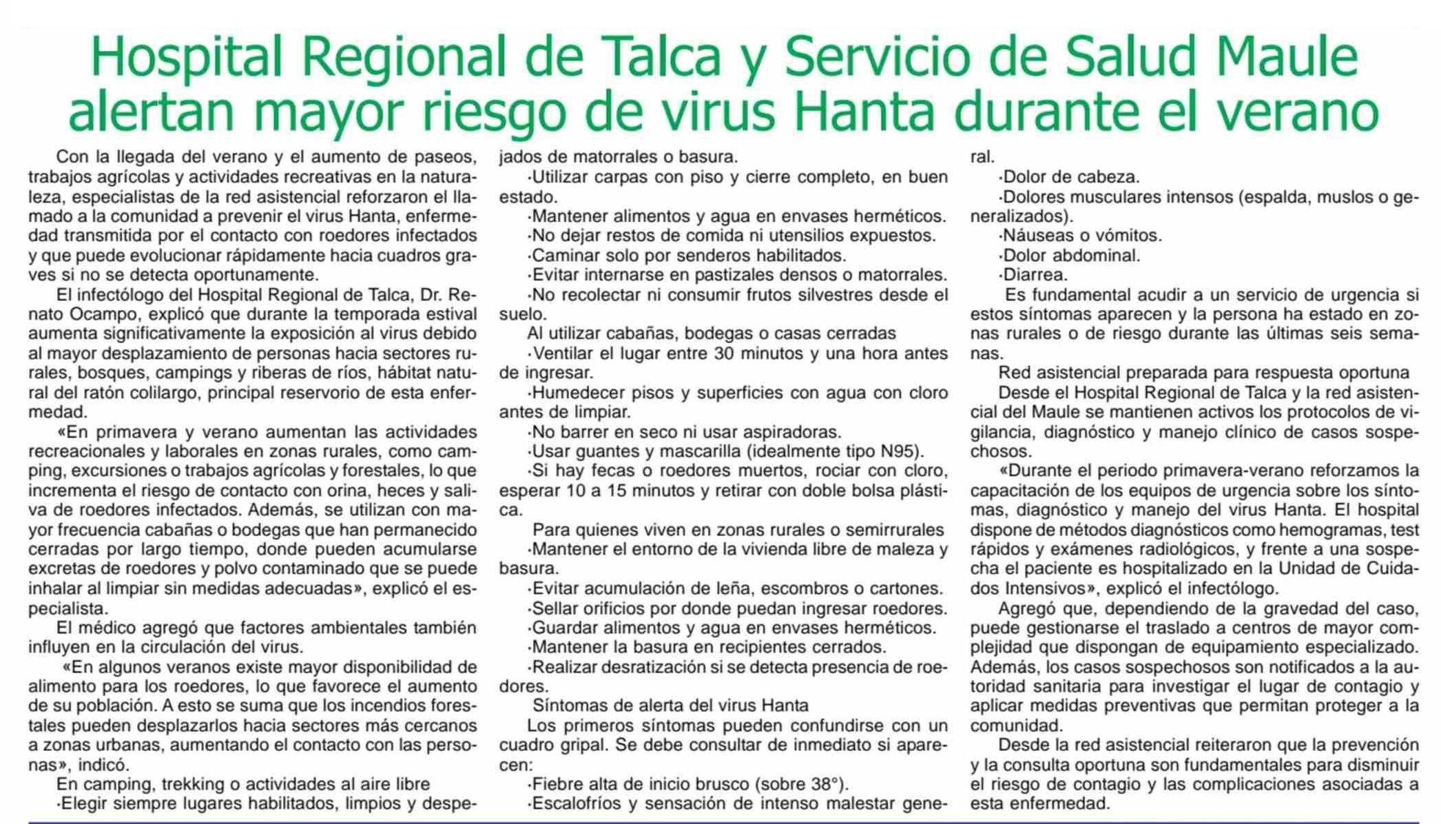 Hospital Regional de Talca y Servicio de Salud Maule alertan mayor riesgo de virus Hanta durante el verano