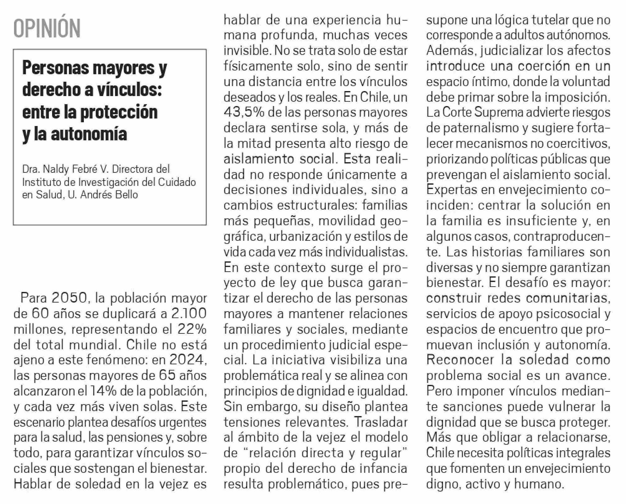 Título: Columnas de Opinión: Para 2050, la población mayor de 60 años se duplicará a 2.100 millones, representando el 22% del total mundial. Chile no está ajeno a este fenómeno: en 2024, las personas mayores de 65 años alcanzaron el 14% de la población, y cada vez más viven solas. Este escenario plantea des