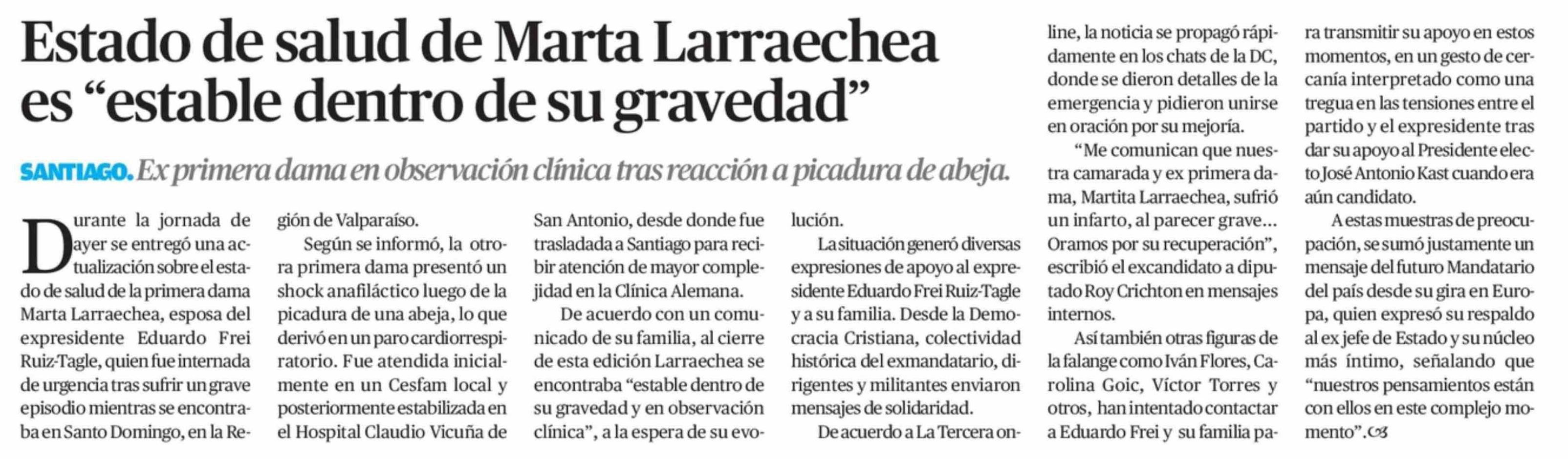 Estado de salud de Marta Larraechea es "estable dentro de su gravedad"