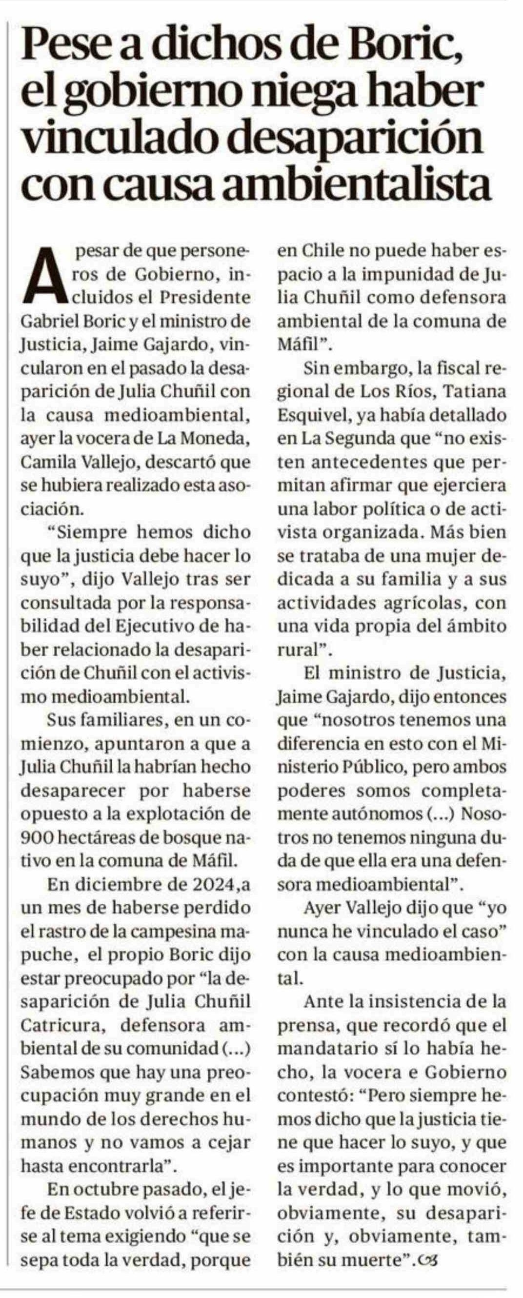 Pese a dichos de Boric, el gobierno niega haber vinculado desaparición con causa ambientalista