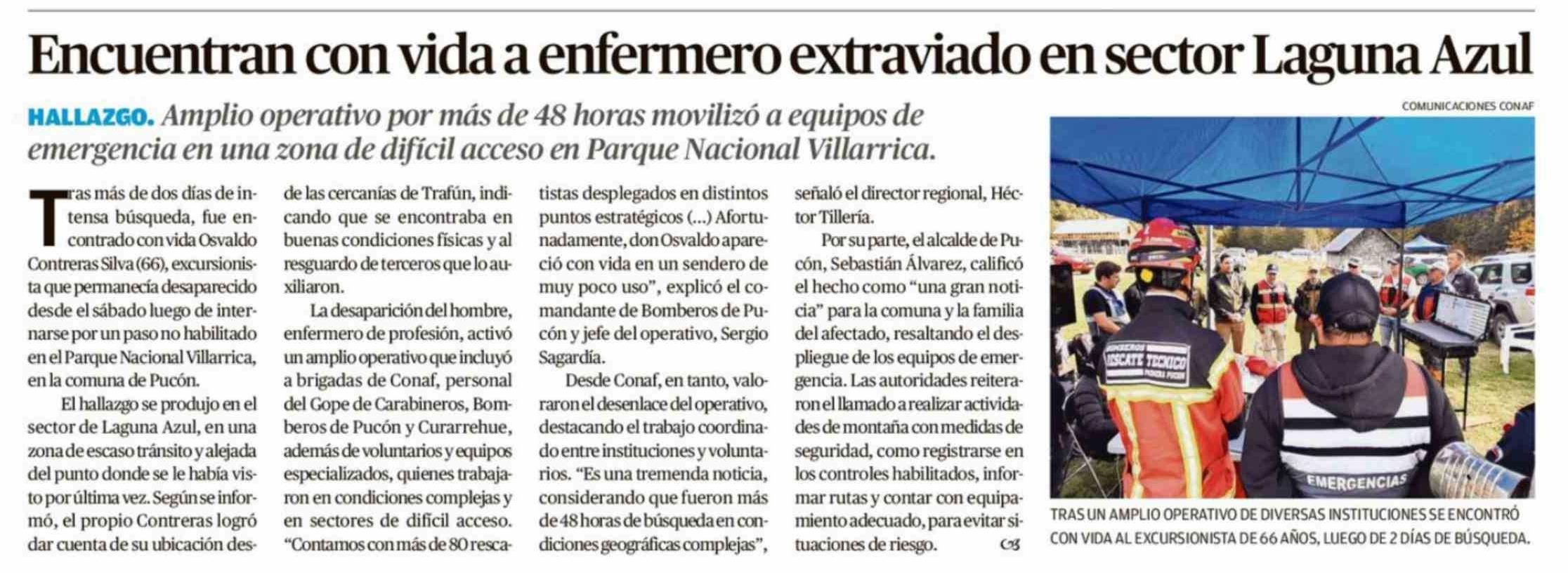 Encuentran con vida a enfermero extraviado en sector Laguna Azul