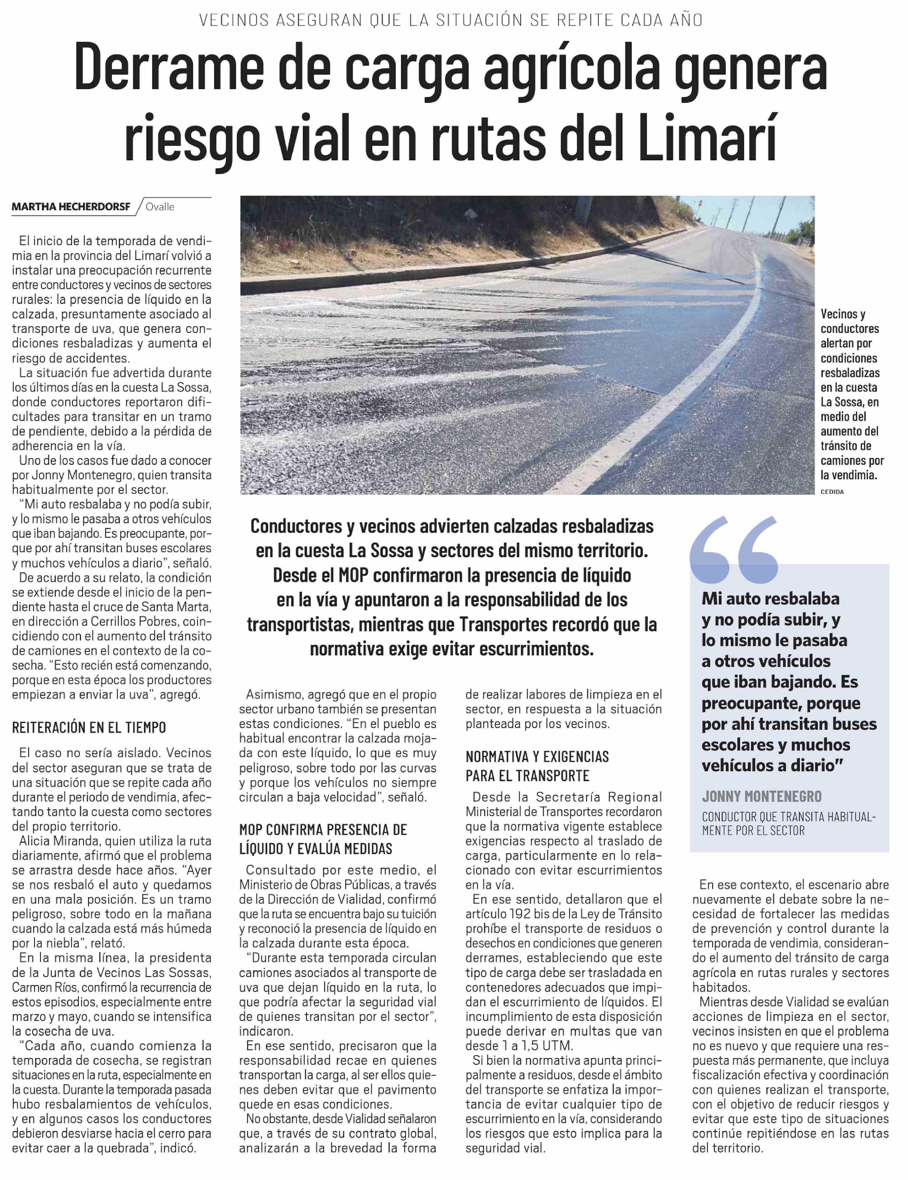Derrame de carga agrícola genera riesgo vial en rutas del Limarí
