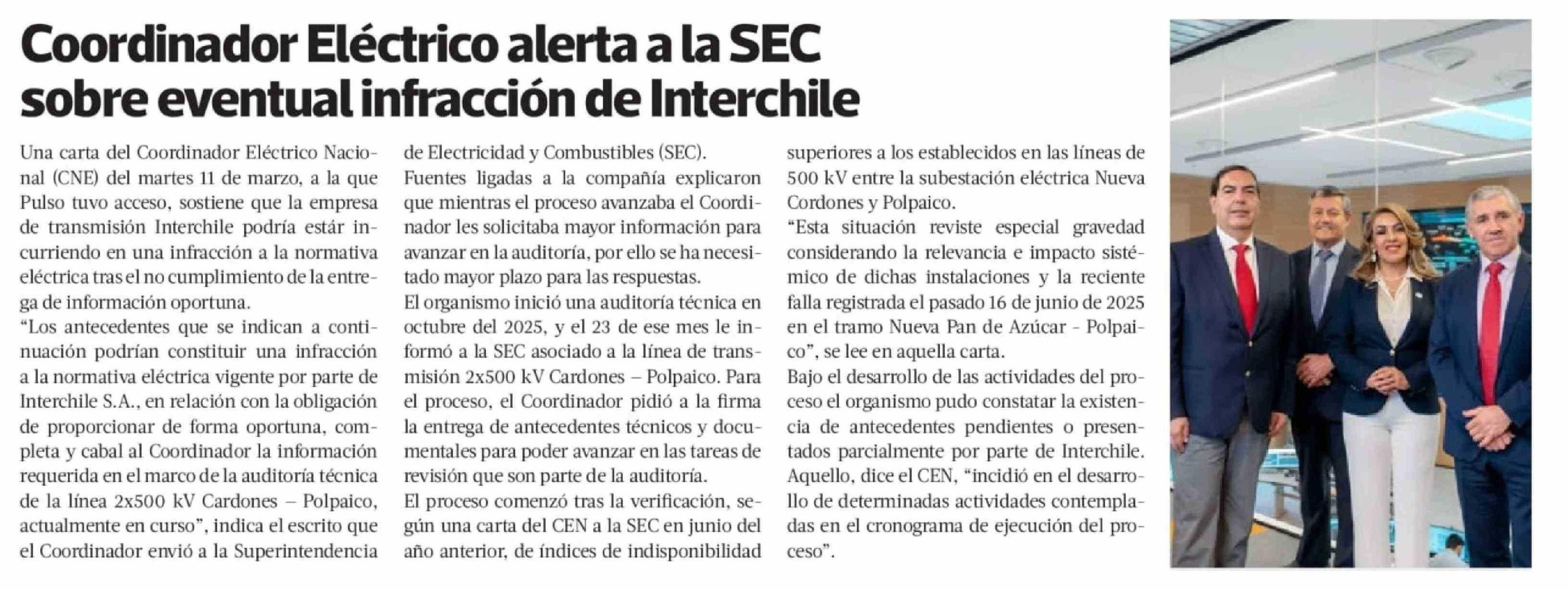 Coordinador Eléctrico alerta a la SEC sobre eventual infracción de Interchile