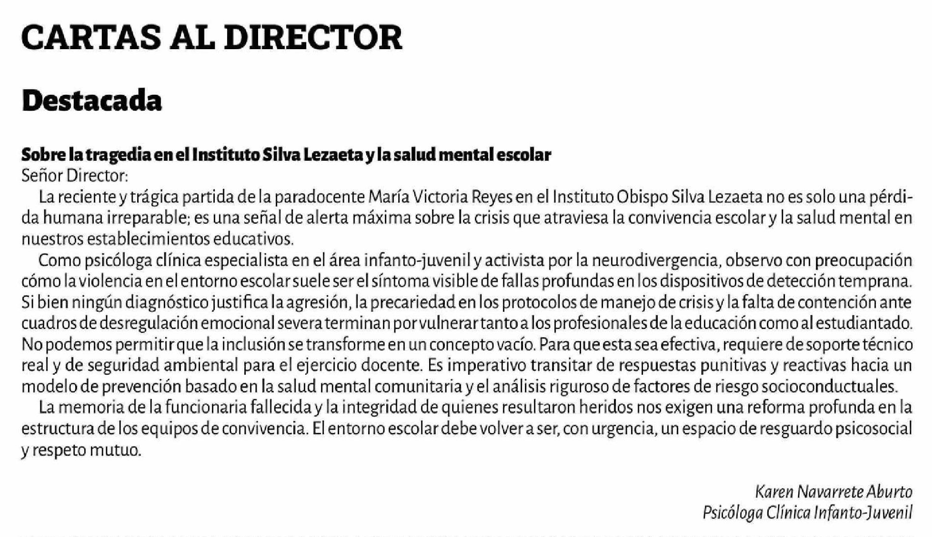 Título: Cartas: Sobre la tragedia en el Instituto Silva Lezaeta y la salud mental escolar Señor Director: La reciente y trágica partida de la paradocente María Victoria Reyes en el Instituto Obispo Silva Lezaeta no es solo una pérdida humana irreparable; es una señal de alerta máxima sobre la crisis que atr