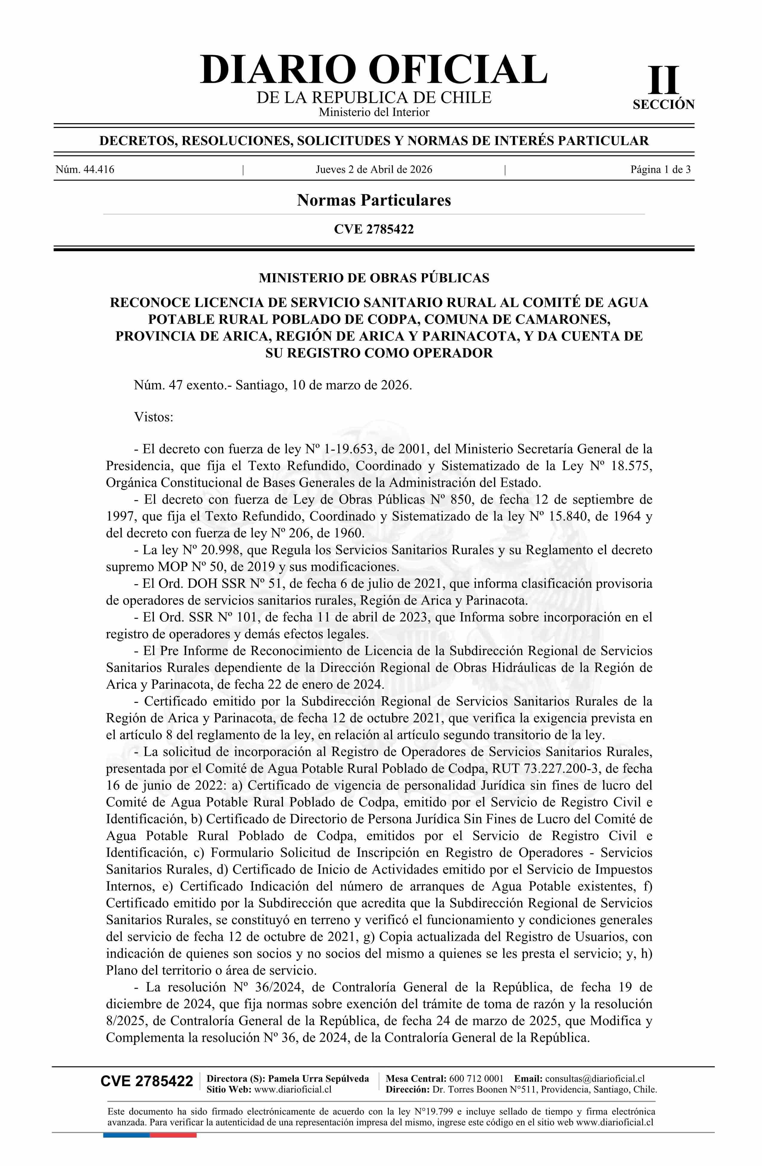 Título: Decreto exento número 47, de 2026.- Reconoce Licencia de Servicio Sanitario Rural al Comité de Agua Potable Rural Poblado de Codpa, comuna de Camarones, provincia de Arica, Región de Arica y Parinacota, y da cuenta de su registro como operador