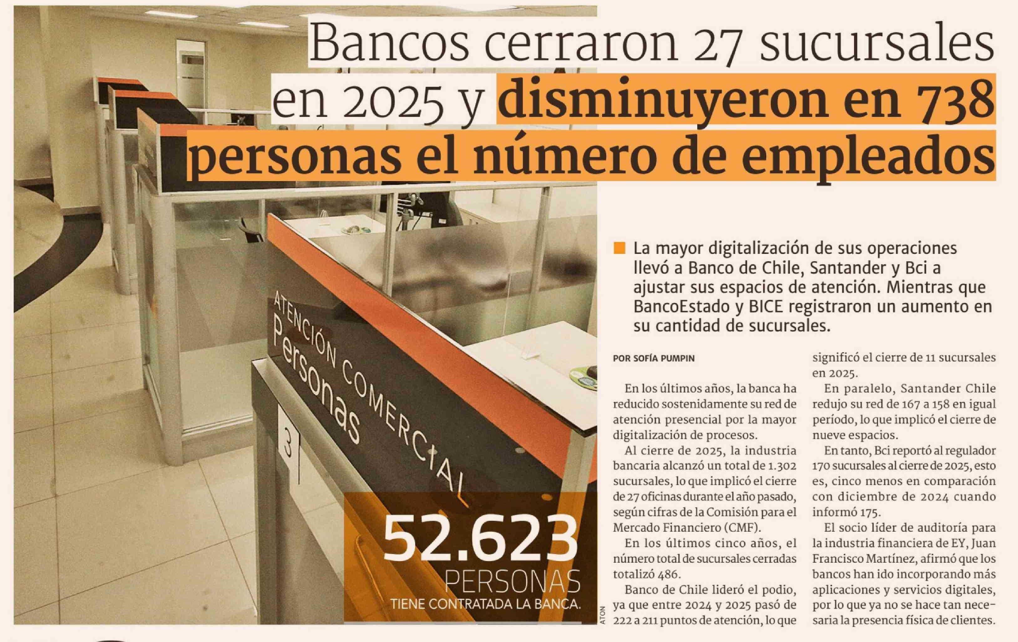 Bancos cerraron 27 sucursales en 2025 y disminuyeron en 738 personas el número de empleados