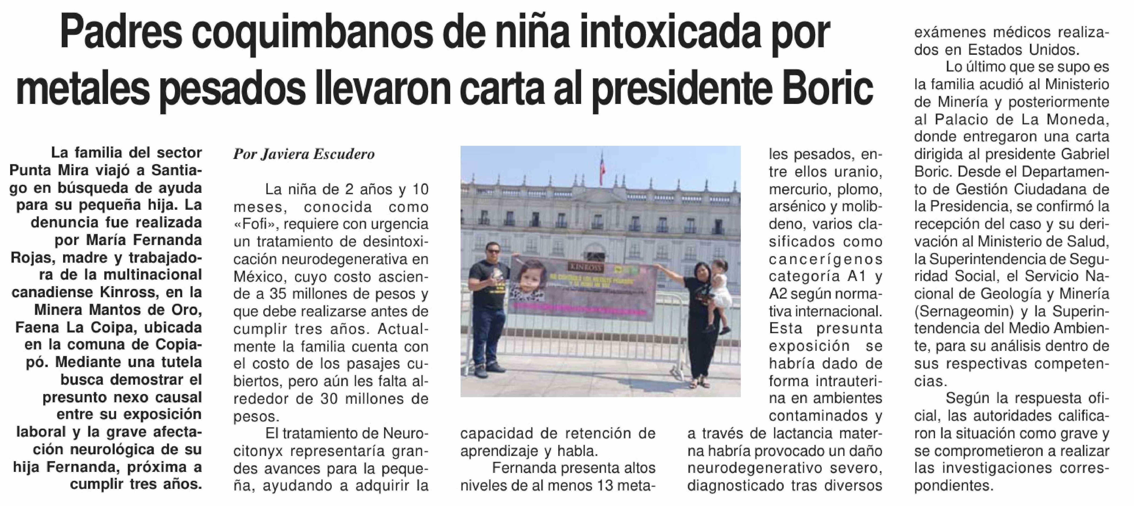 Título: Padres coquimbanos de niña intoxicada por metales pesados llevaron carta al presidente Boric