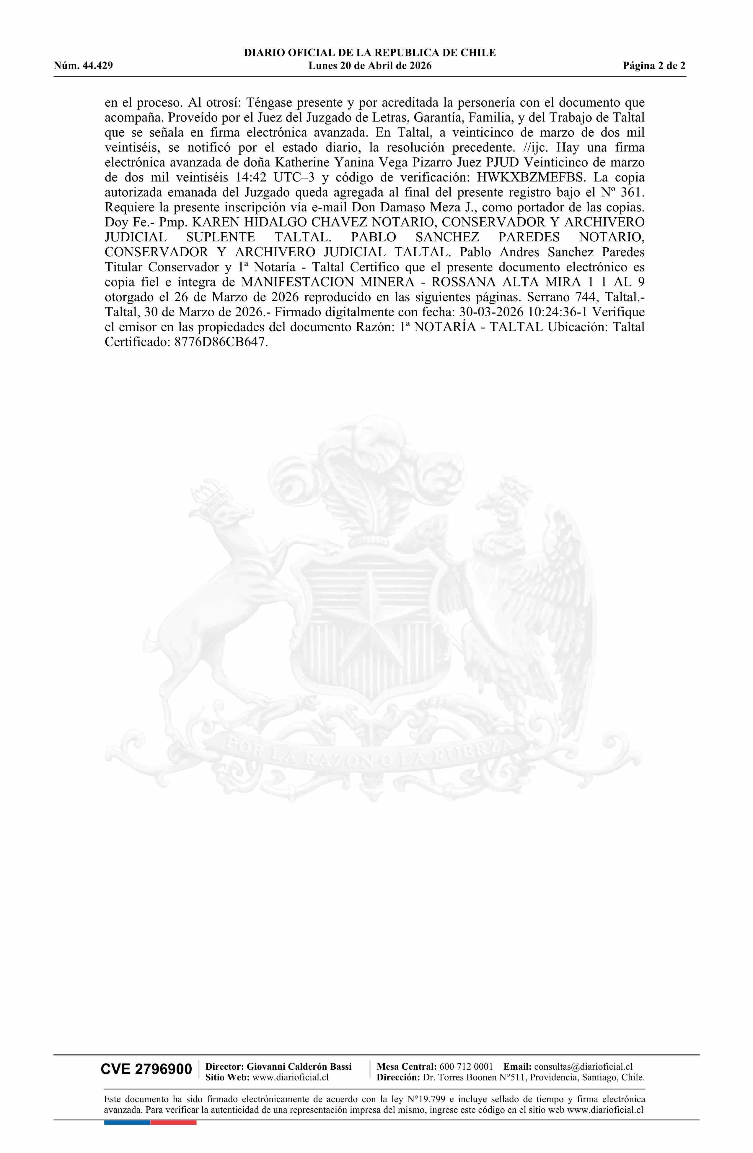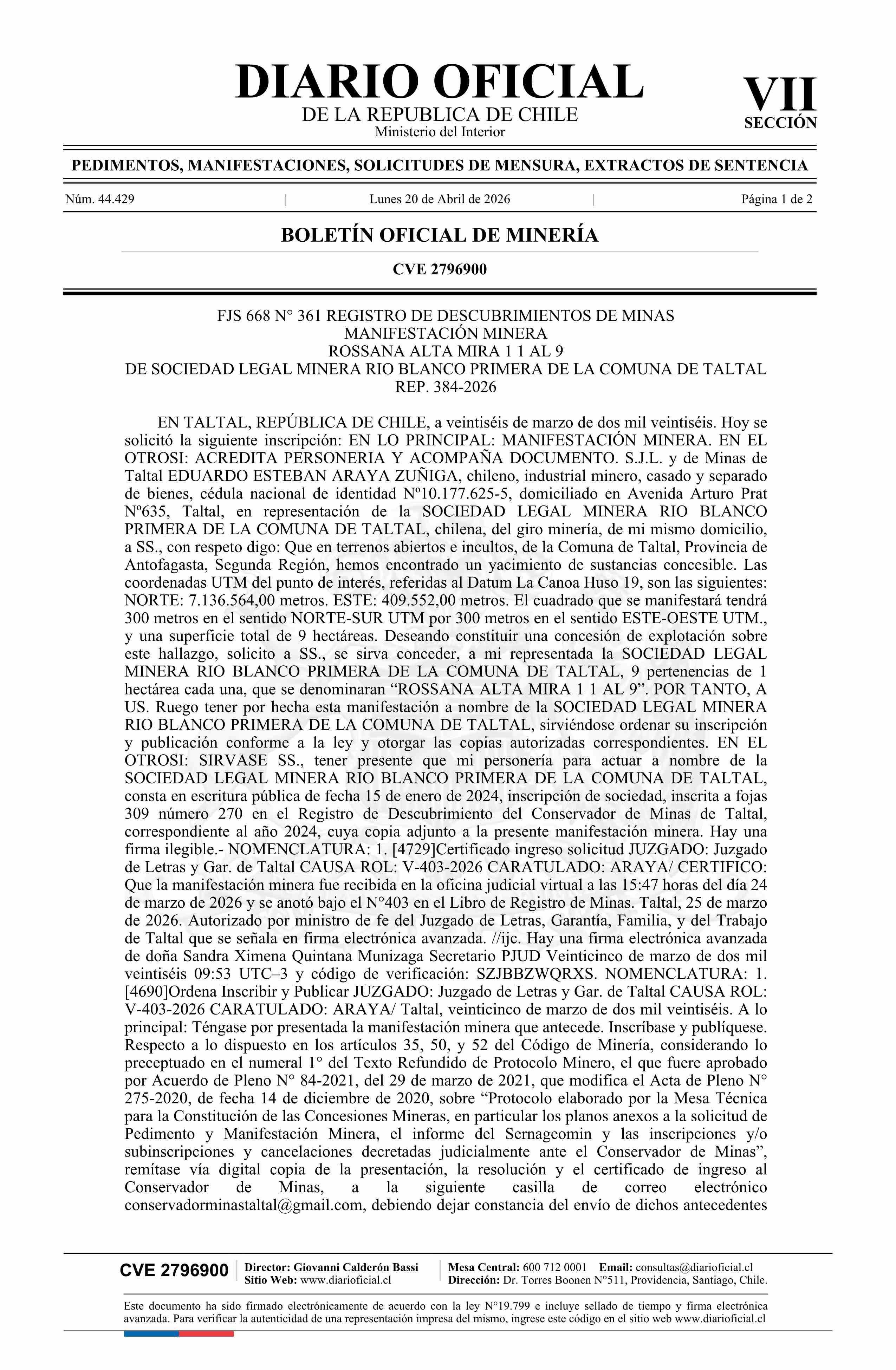 | Fuente: | DIARIO OFICIAL CHILE - BOLETÍN OFICIAL DE MINERÍA (DIARIO OFICIAL CHILE – BOM – MANIFESTACIONES MIN) | Página(s): | 17-18 |