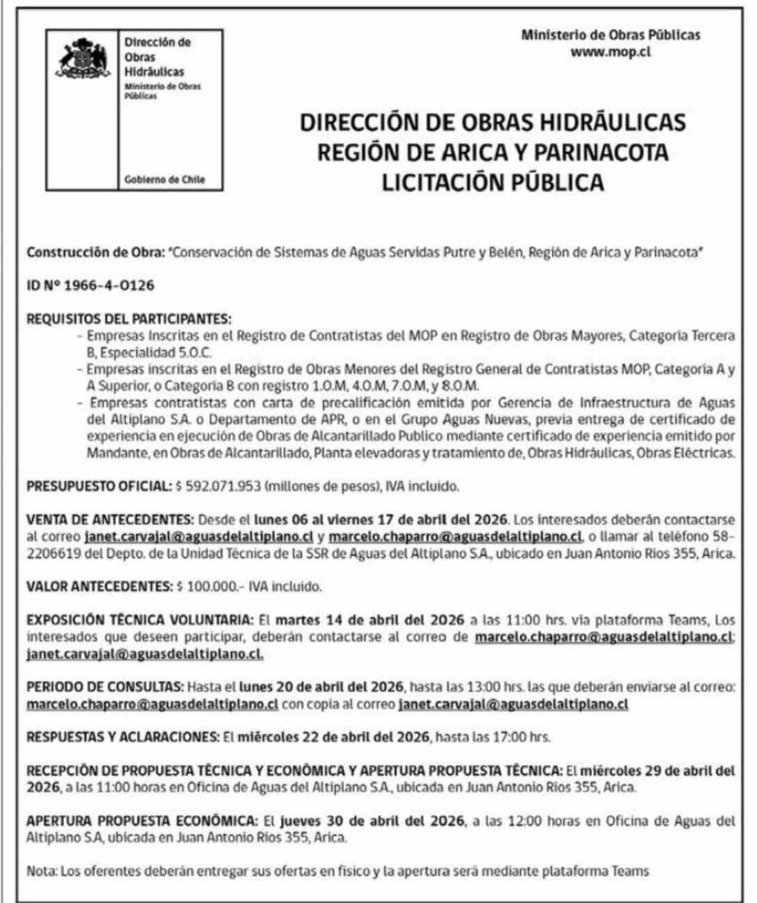 Aviso Licitaciones: DIRECCIÓN DE OBRAS HIDRÁULICAS REGION DE ARICA Y PARINACOTA