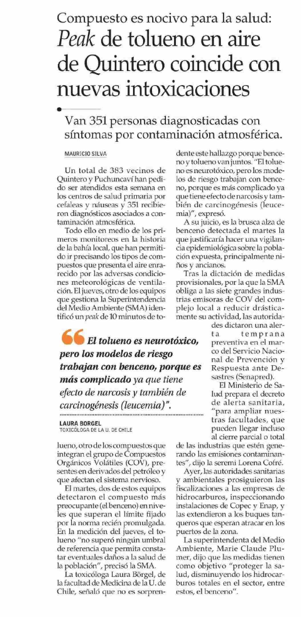 Peak de tolueno en aire de Quintero coincide con nuevas intoxicaciones