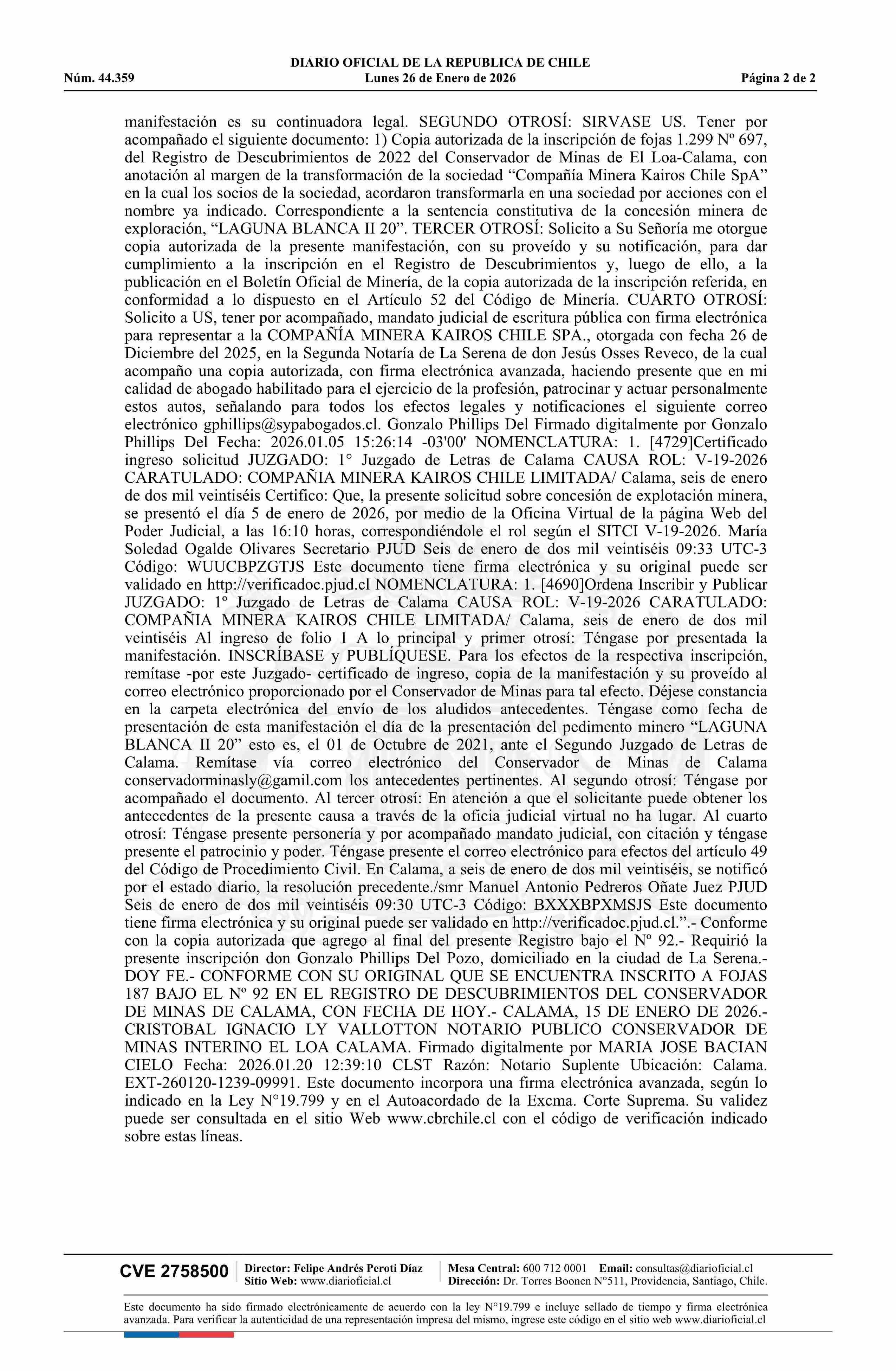 LAGUNA BLANCA II 20, 1 AL 20 / Compañía Minera Kairos Chile SpA