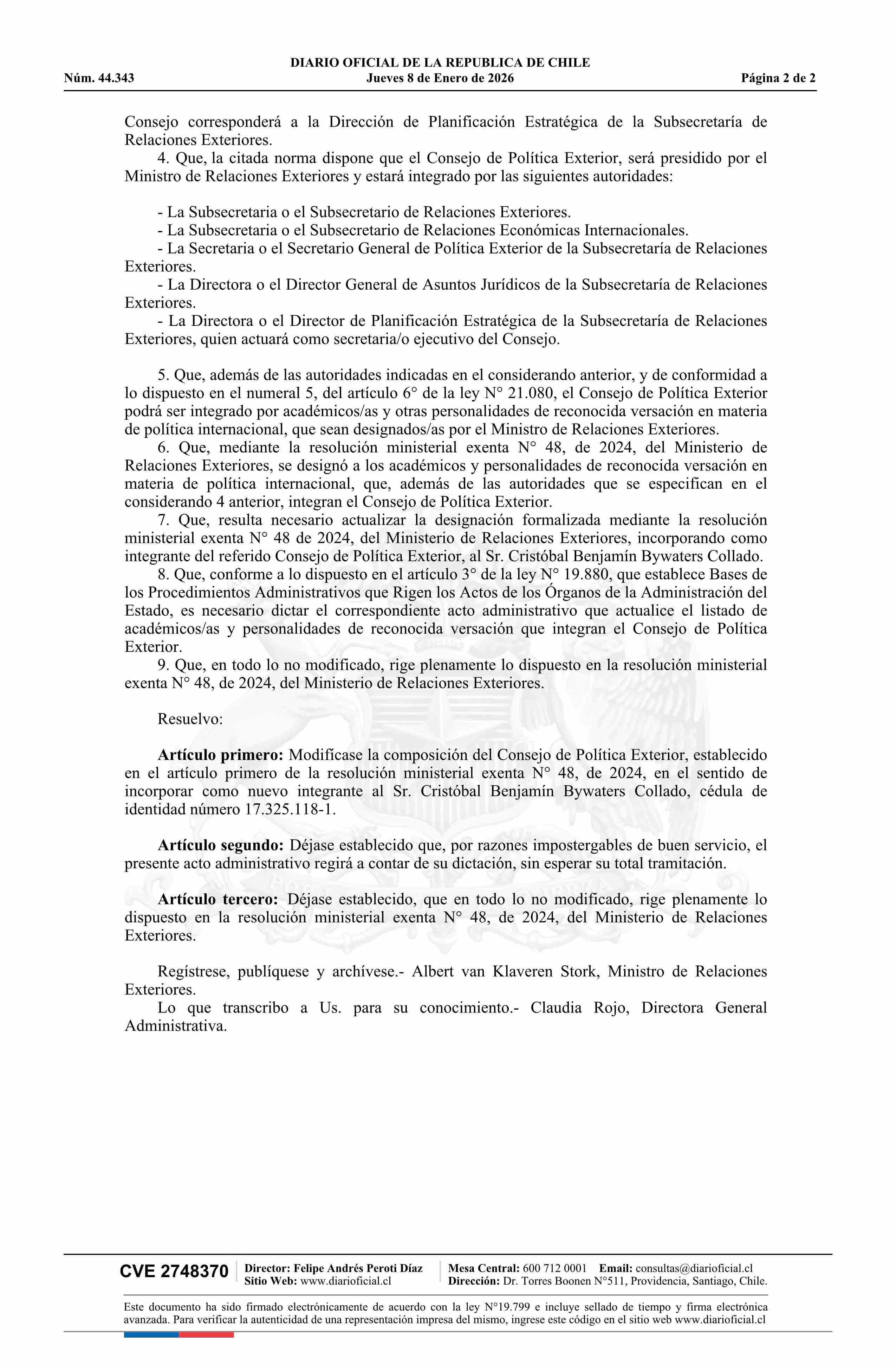 | Título: | Resolución exenta número 105, de 2025.- Modifica resolución N° 48 exenta, de 2024, que designa integrantes del Consejo de Política Exterior del Ministerio de Relaciones Exteriores |