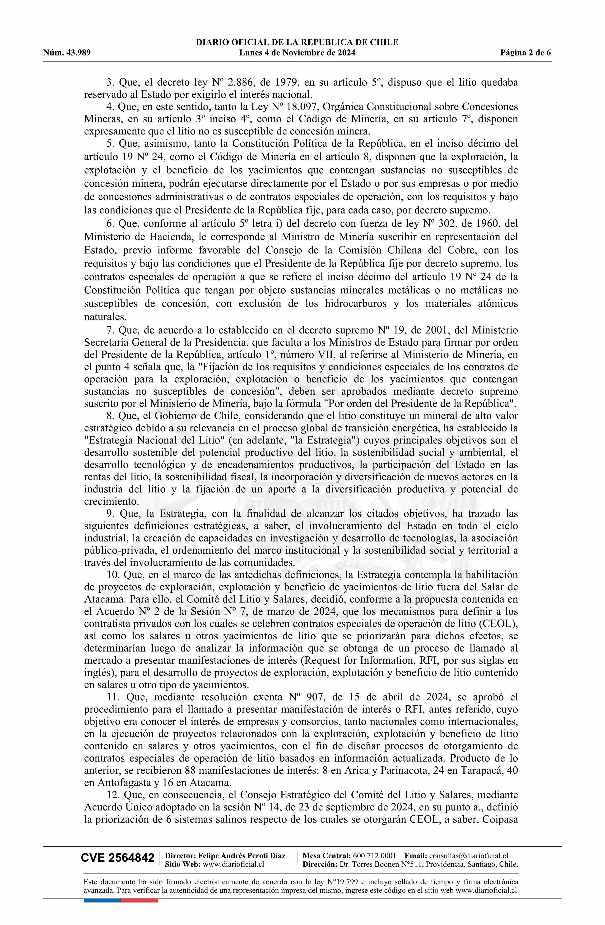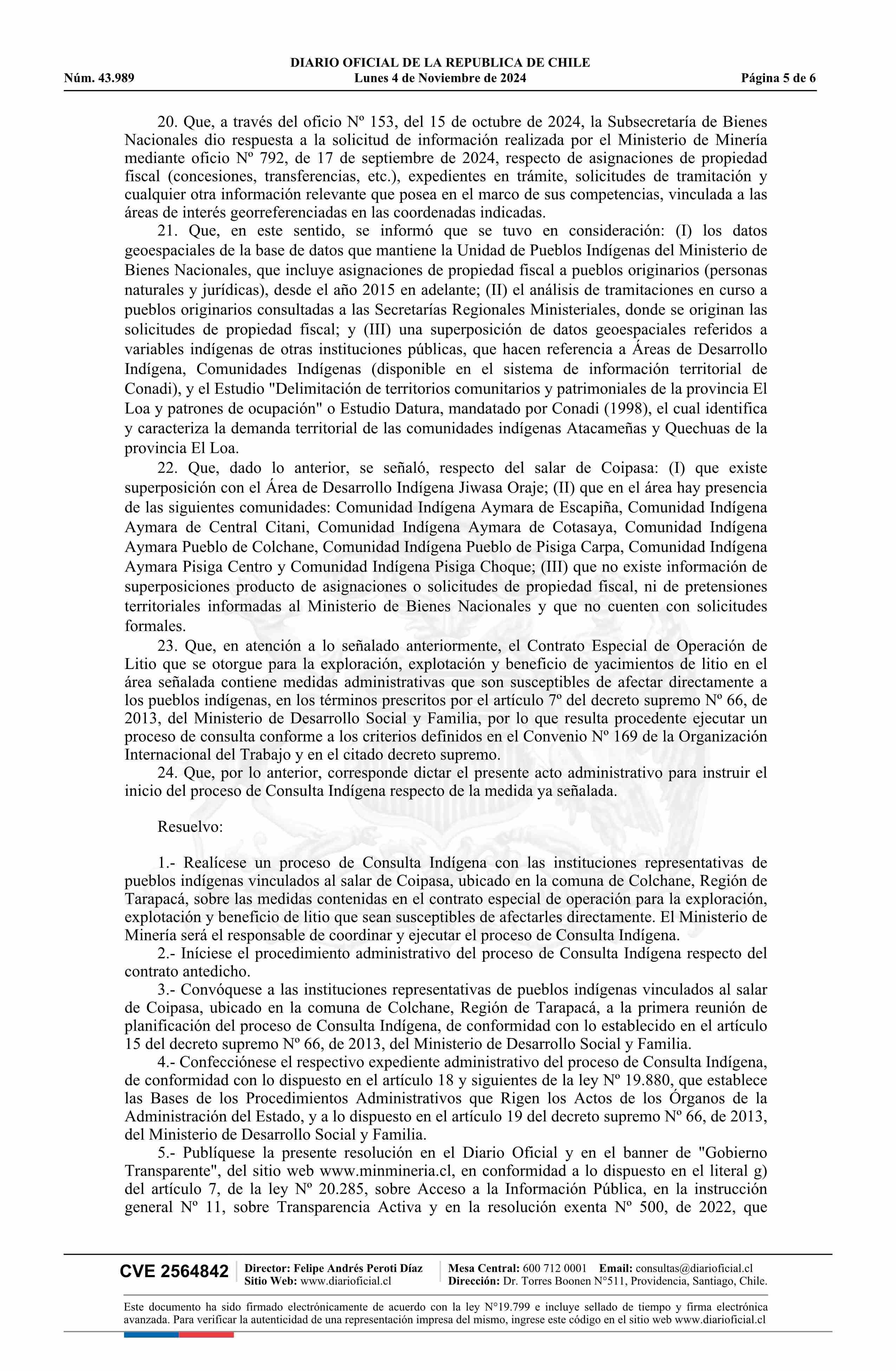 | Título: | Resolución exenta número 2.748, de 2024.- Instruye la realización de un proceso de consulta indígena sobre contrato especial de operación para la exploración, explotación y beneficio de litio en el Salar de Coipasa de la Región de Tarapacá |