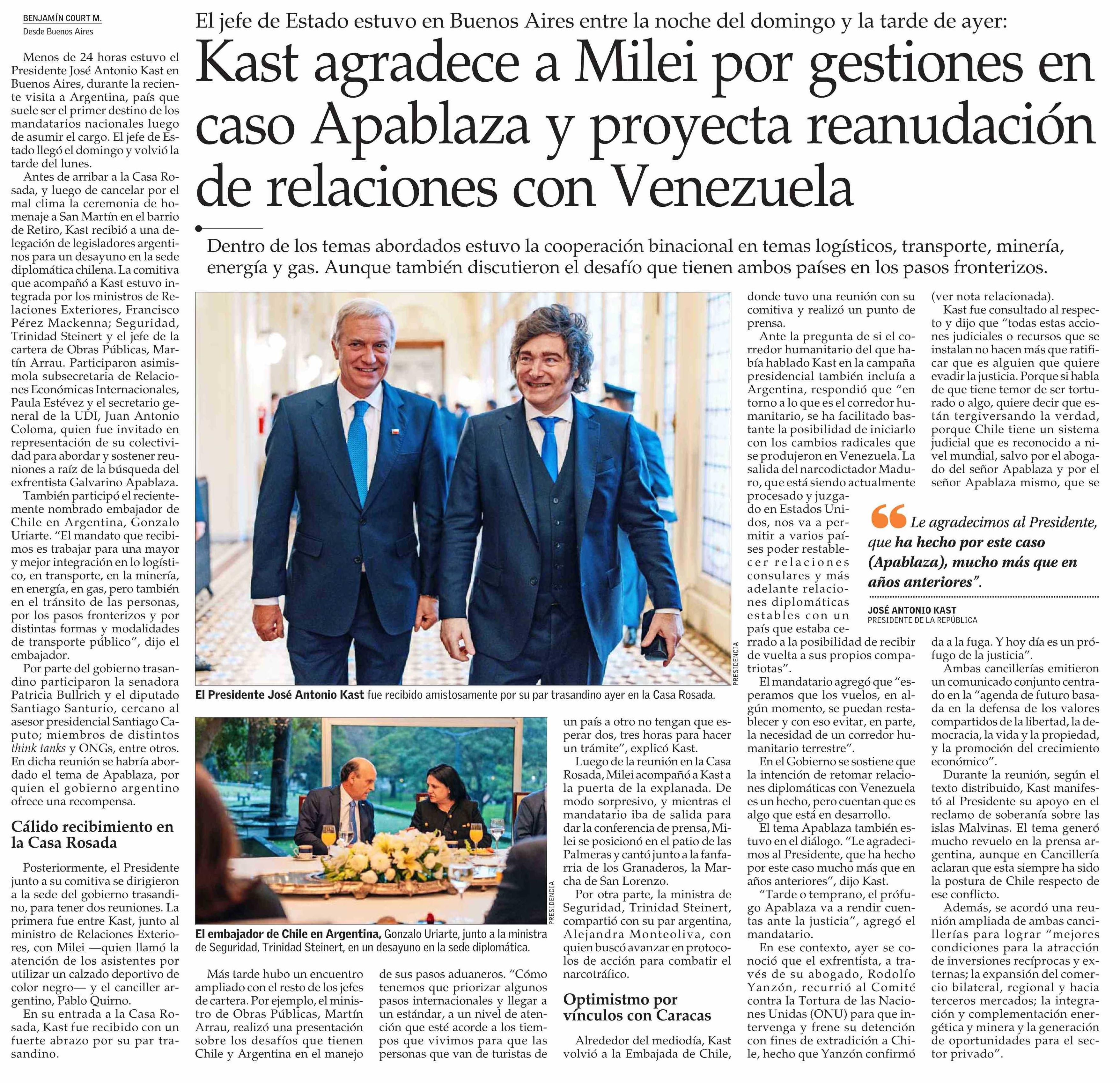 Kast agradece a Milei por gestiones en caso Apablaza y proyecta reanudación de relaciones con Venezuela