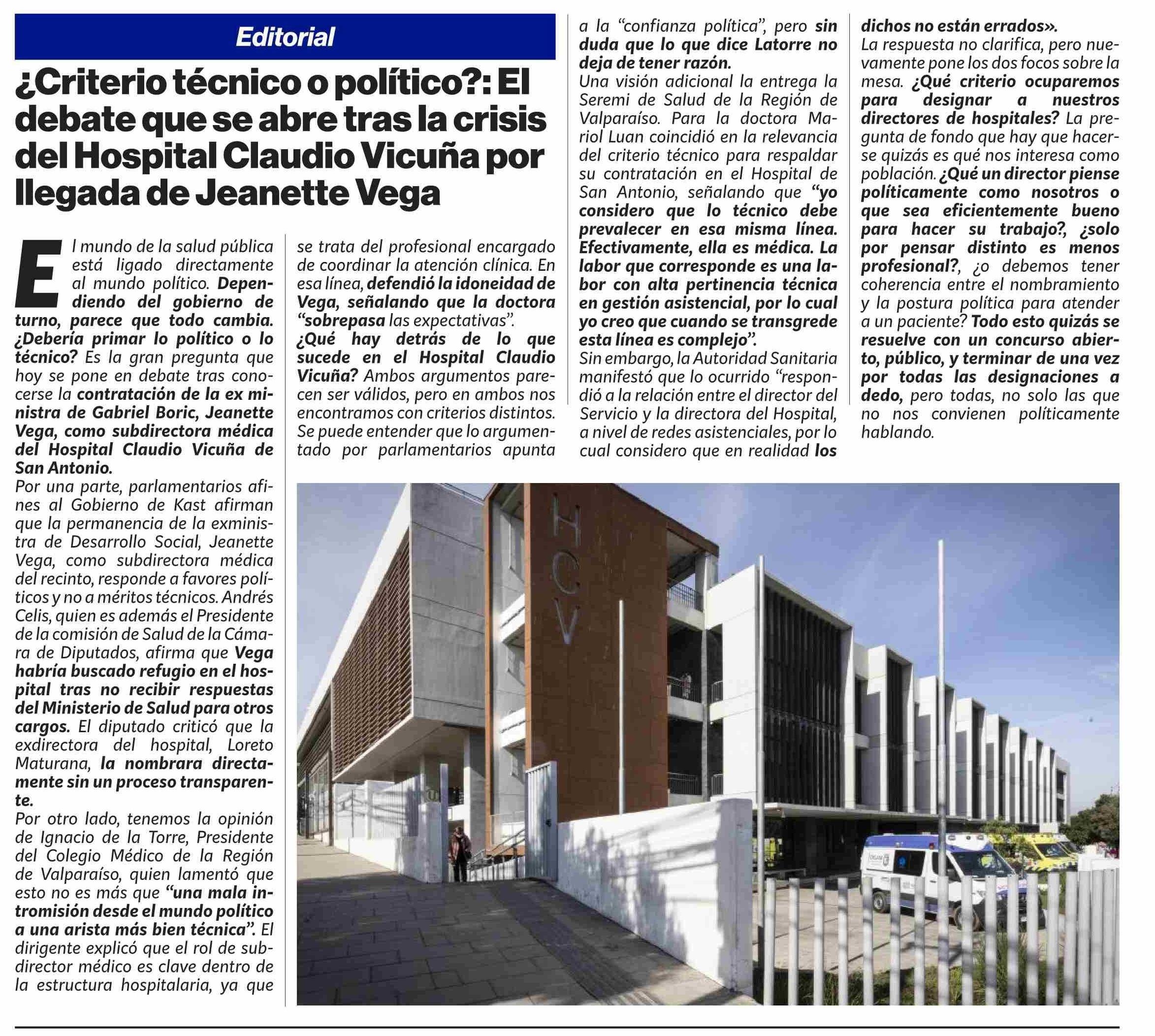 Título: EDITORIAL: ¿Criterio técnico o político?: El debate que se abre tras la crisis del Hospital Claudio Vicuña por llegada de Jeanette Vega