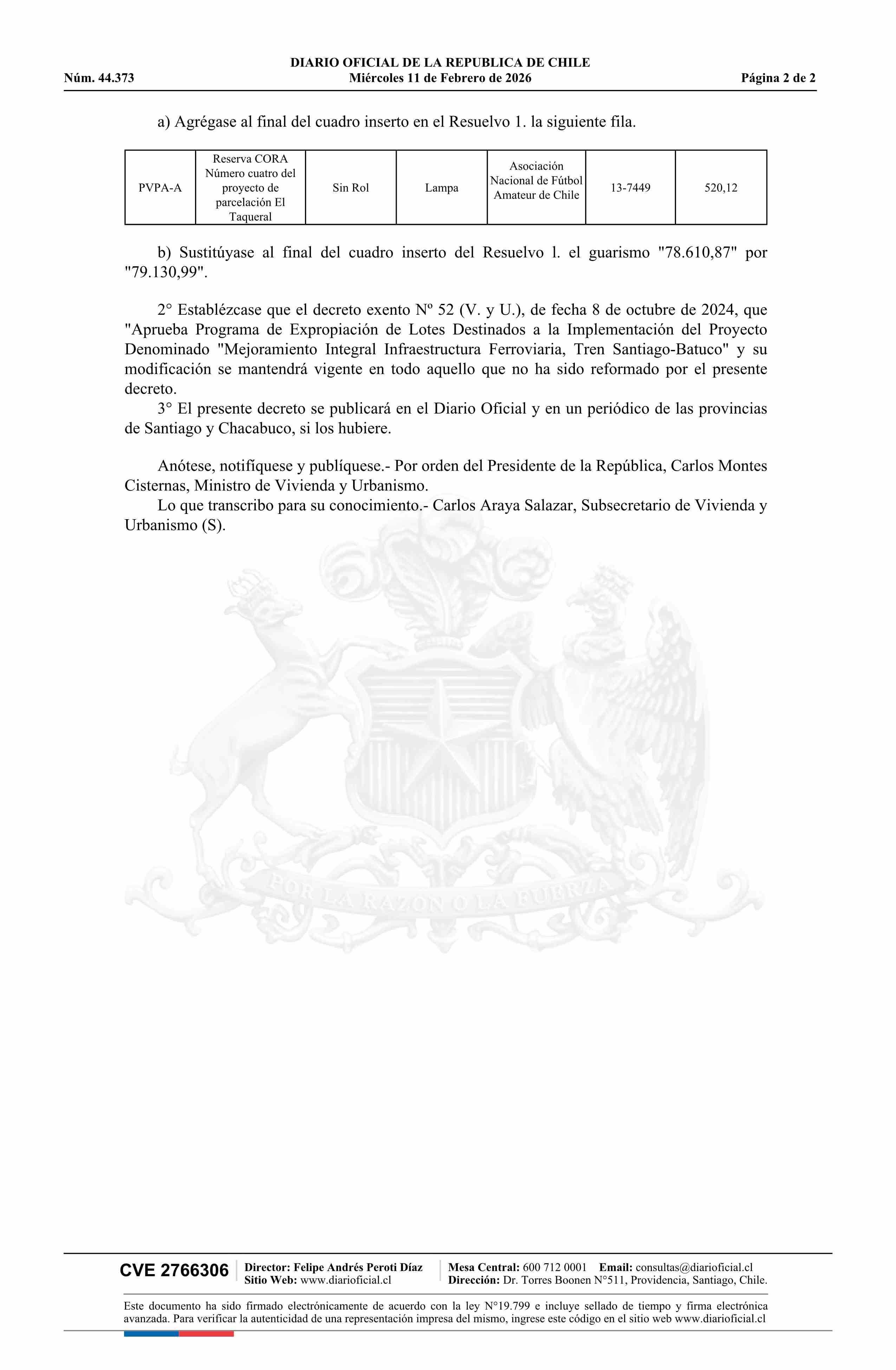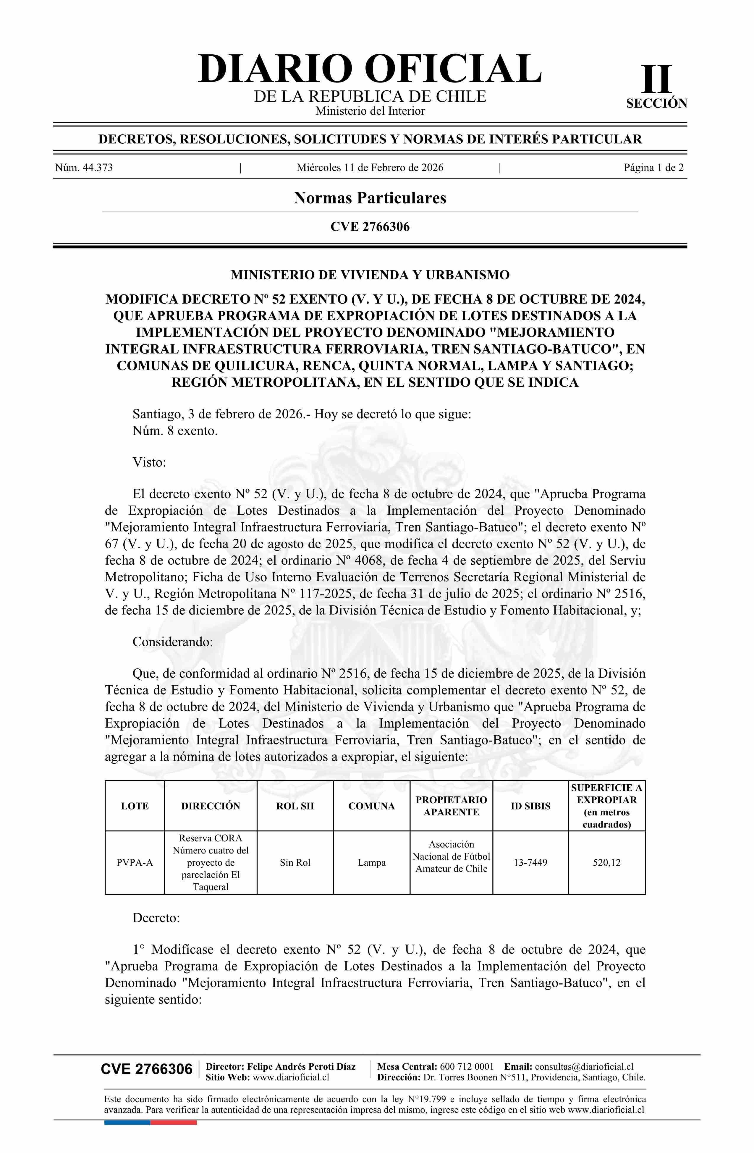 | Título: | Decreto exento número 8, de 2026.- Modifica decreto N° 52 exento, de 2024, que aprueba programa de expropiación de lotes destinados a la implementación del proyecto denominado Mejoramiento Integral Infraestructura Ferroviaria, Tren Santiago-Batuco, en comunas de Quilicura, Renca, Quinta Normal, Lamp |