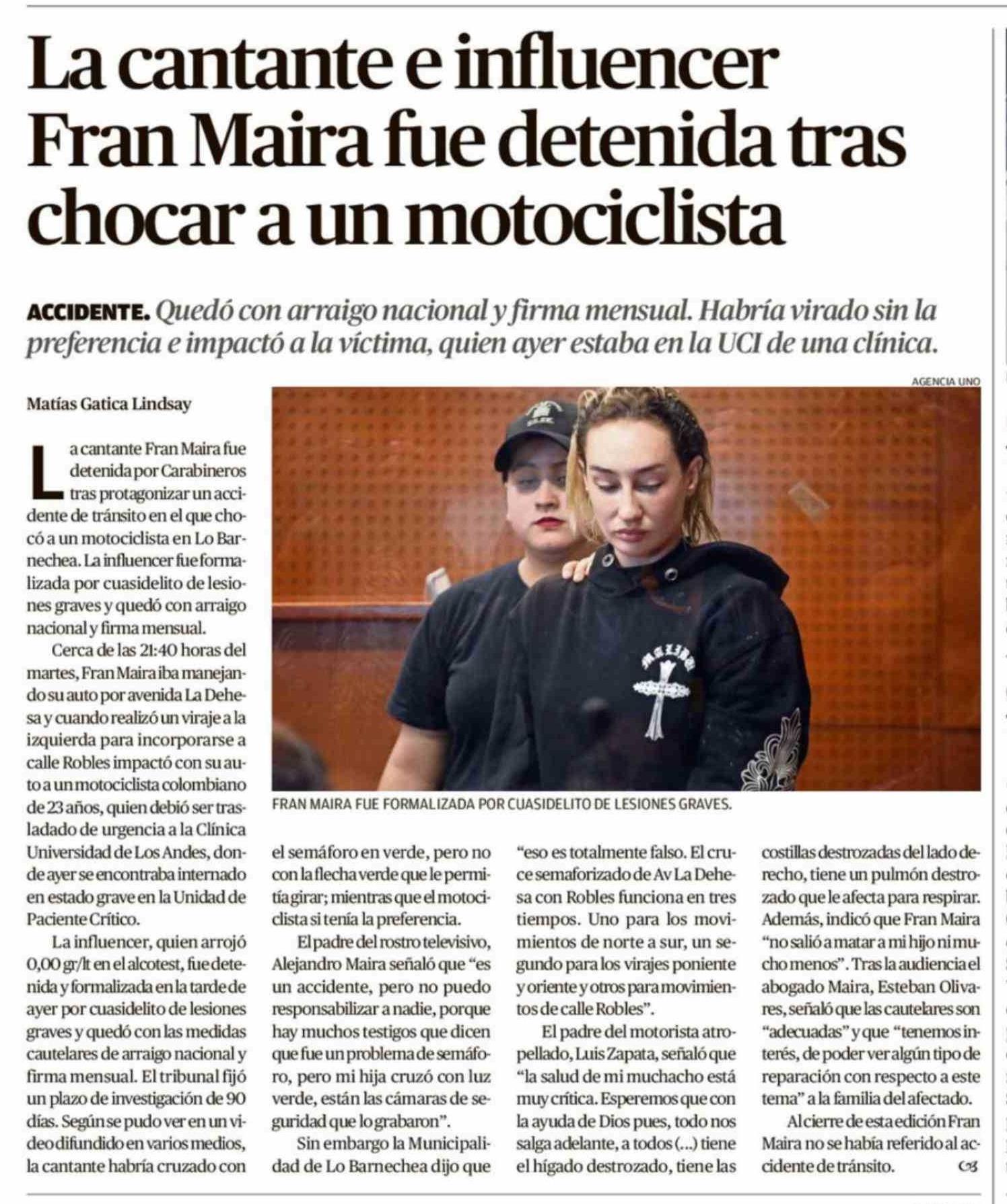 La cantante e influencer Fran Maira fue detenida tras chocar a un motociclista