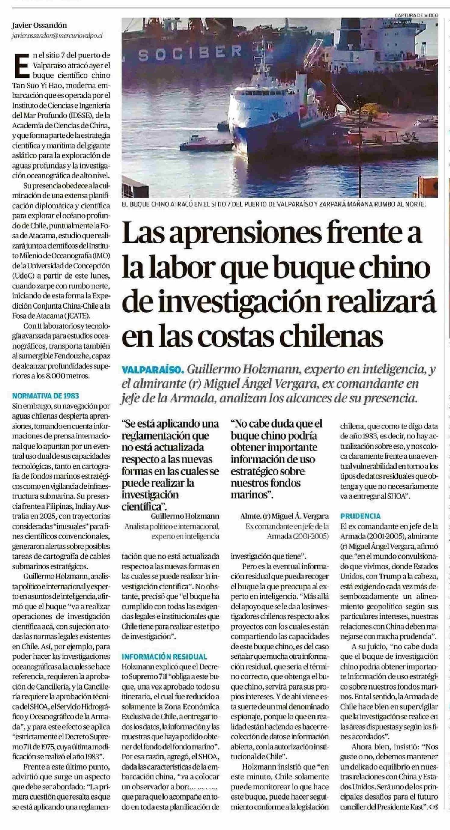 Las aprensiones frente a la labor que buque chino de investigación realizará en las costas chilenas