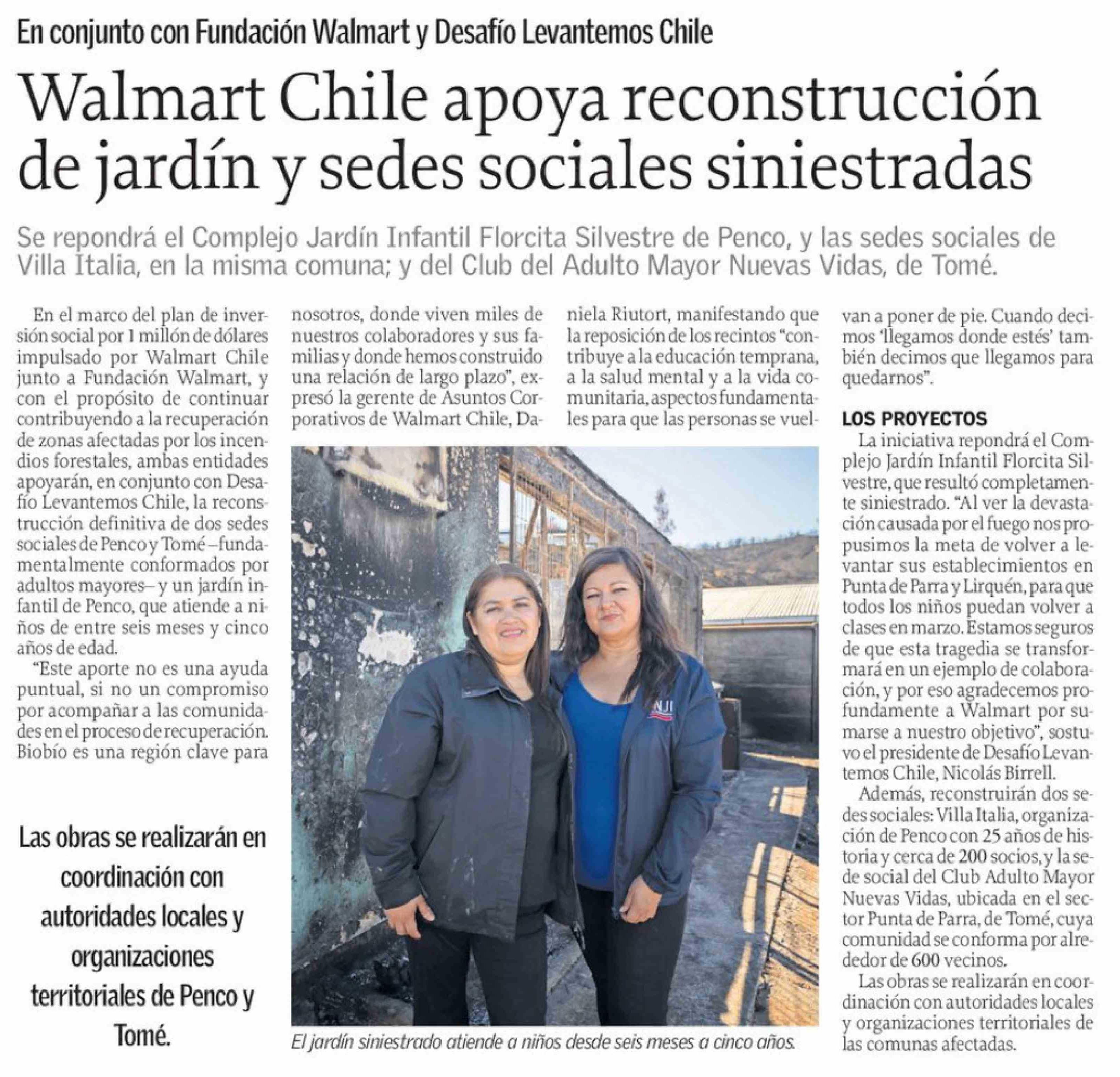 Walmart Chile apoya reconstrucción de jardín y sedes sociales siniestradas