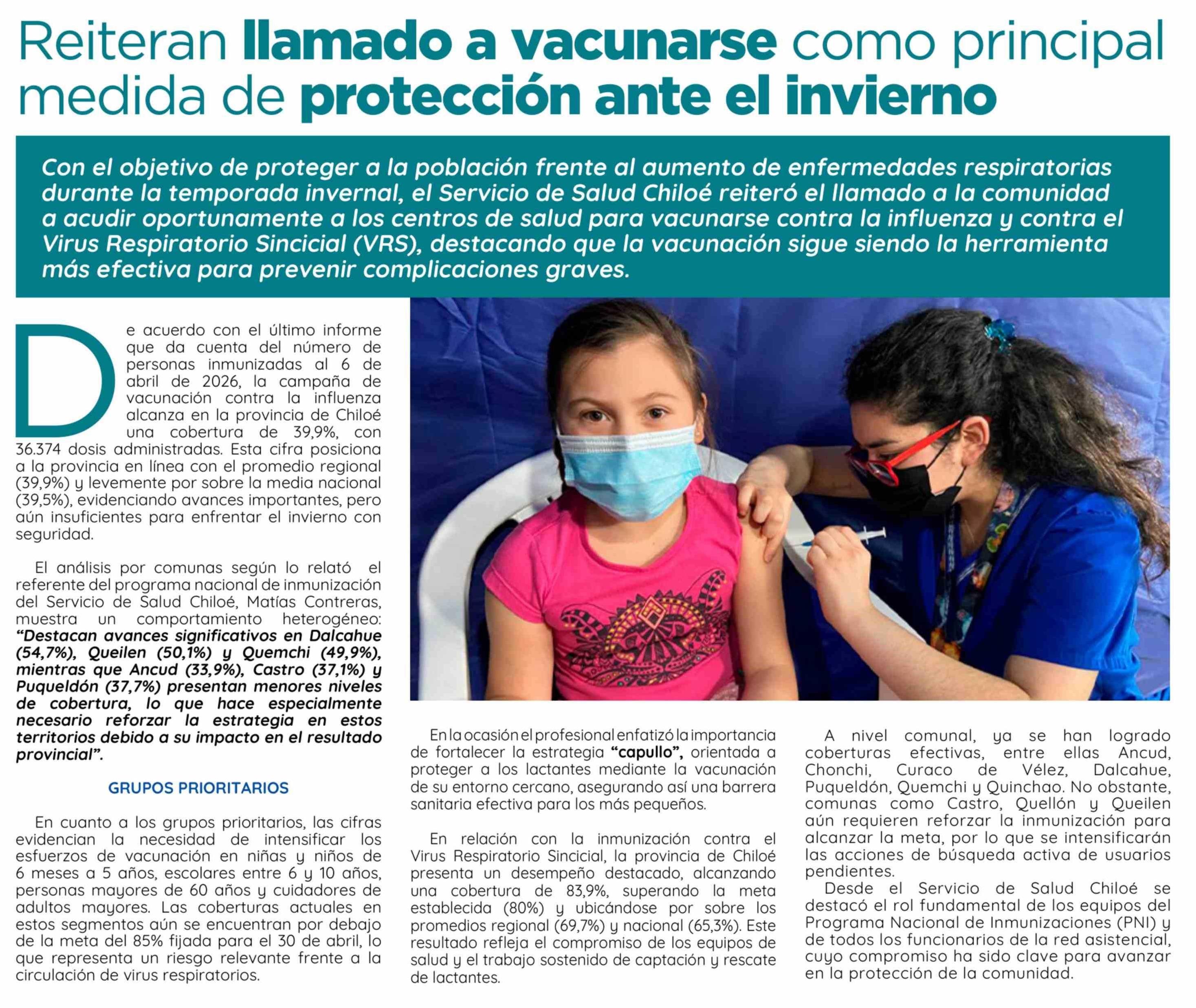 Reiteran llamado a vacunarse como principal medida de protección ante el invierno