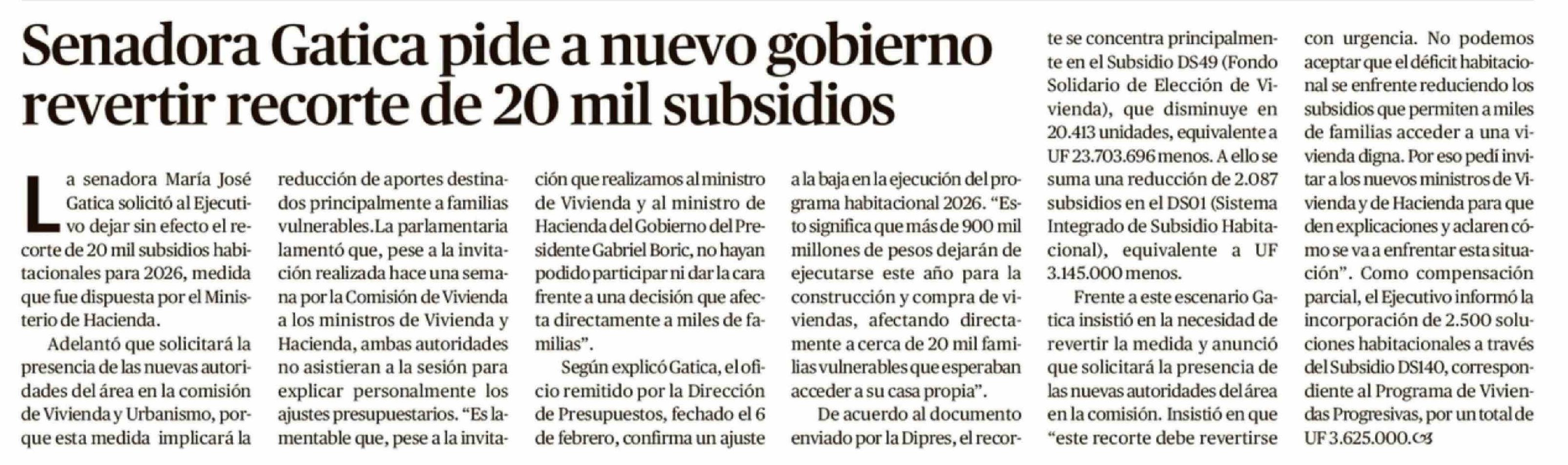 Senadora Gatica pide a nuevo gobierno revertir recorte de 20 mil subsidios