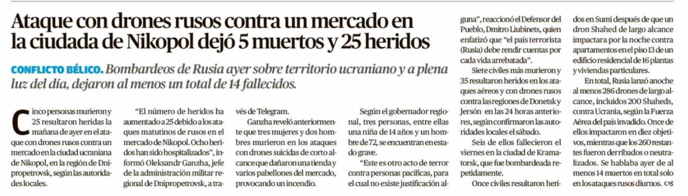 Ataque con drones rusos contra un mercado en la ciudada de Nikopol dejó 5 muertos y 25 heridos