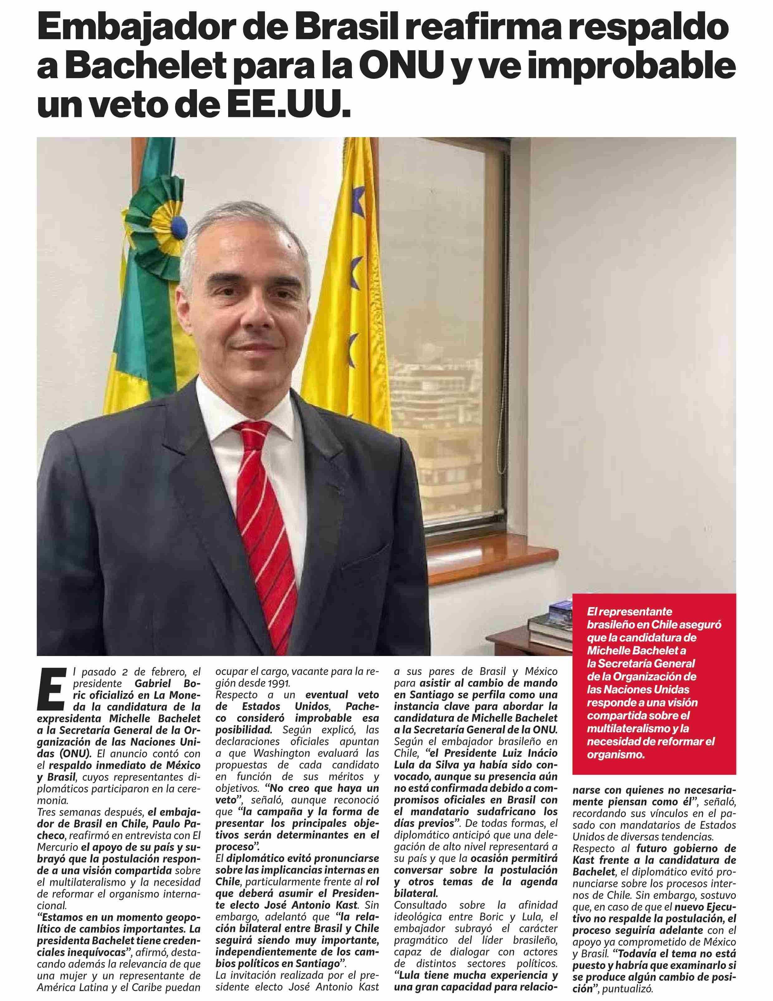 Embajador de Brasil reafirma respaldo a Bachelet para la ONU y ve improbable un veto de EE.UU.