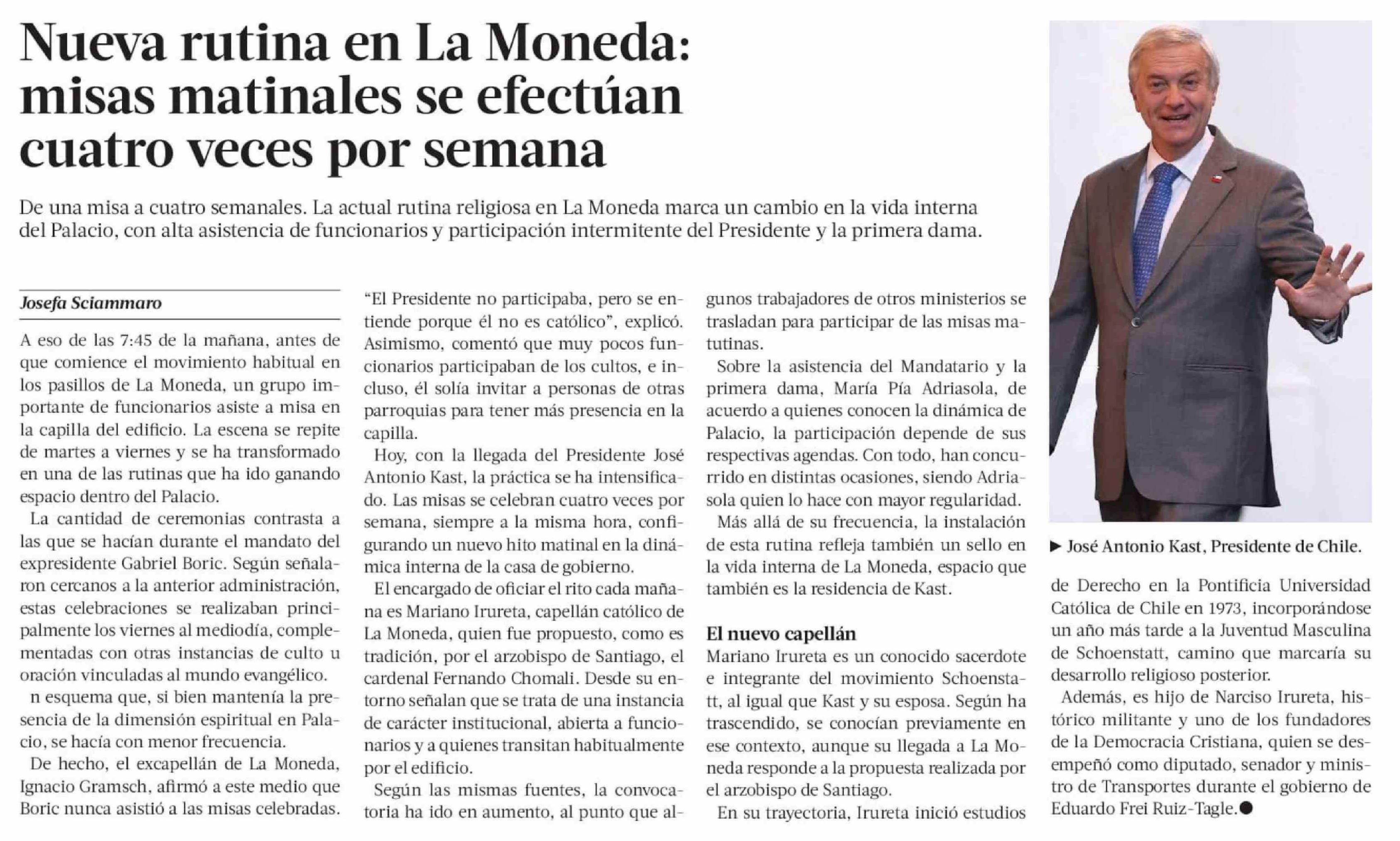 Nueva rutina en La Moneda: misas matinales se efectúan cuatro veces por semana