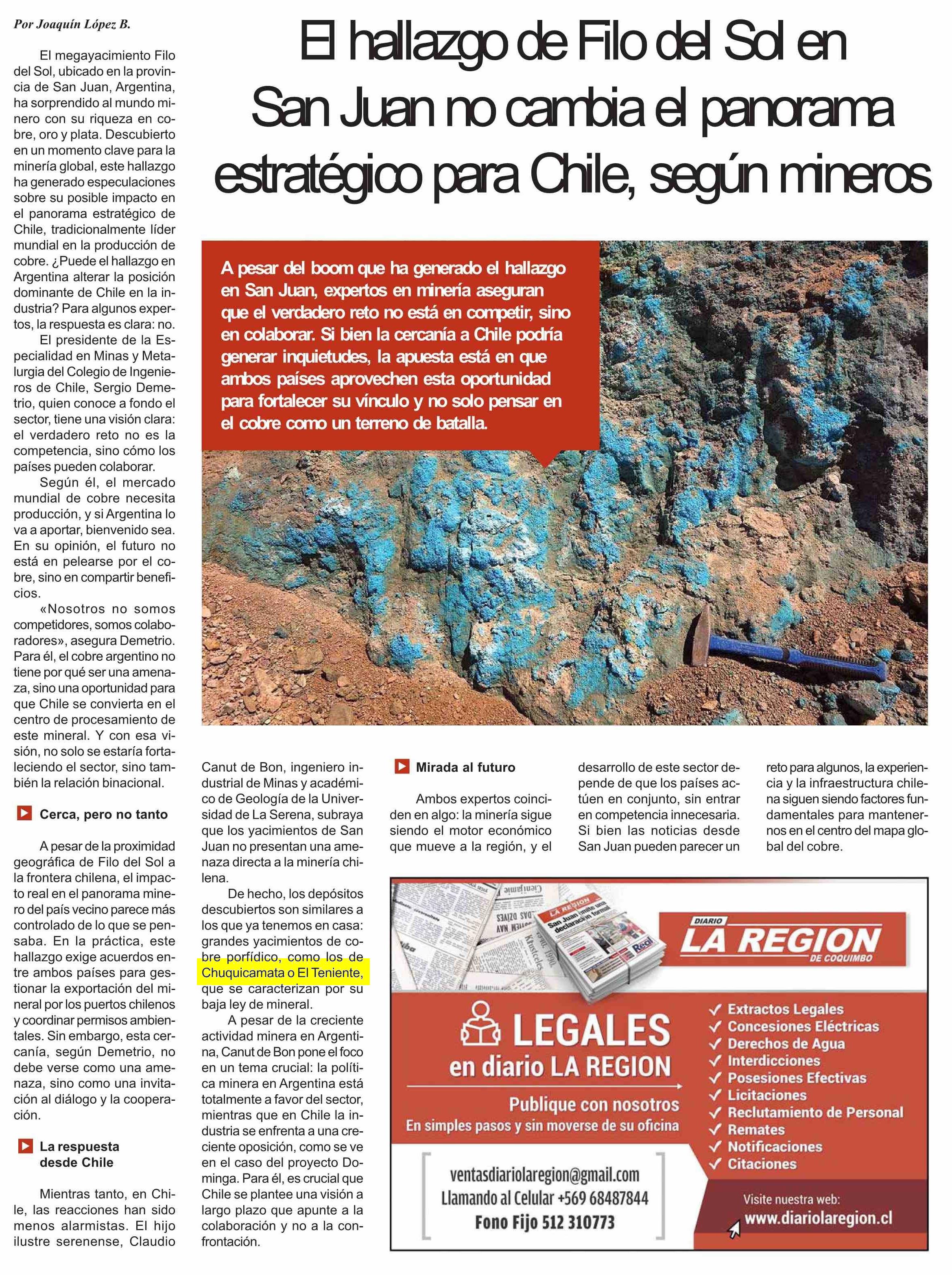 Título: El hallazgo de Filo del Sol en San Juan no cambia el panorama estratégico para Chile, según mineros