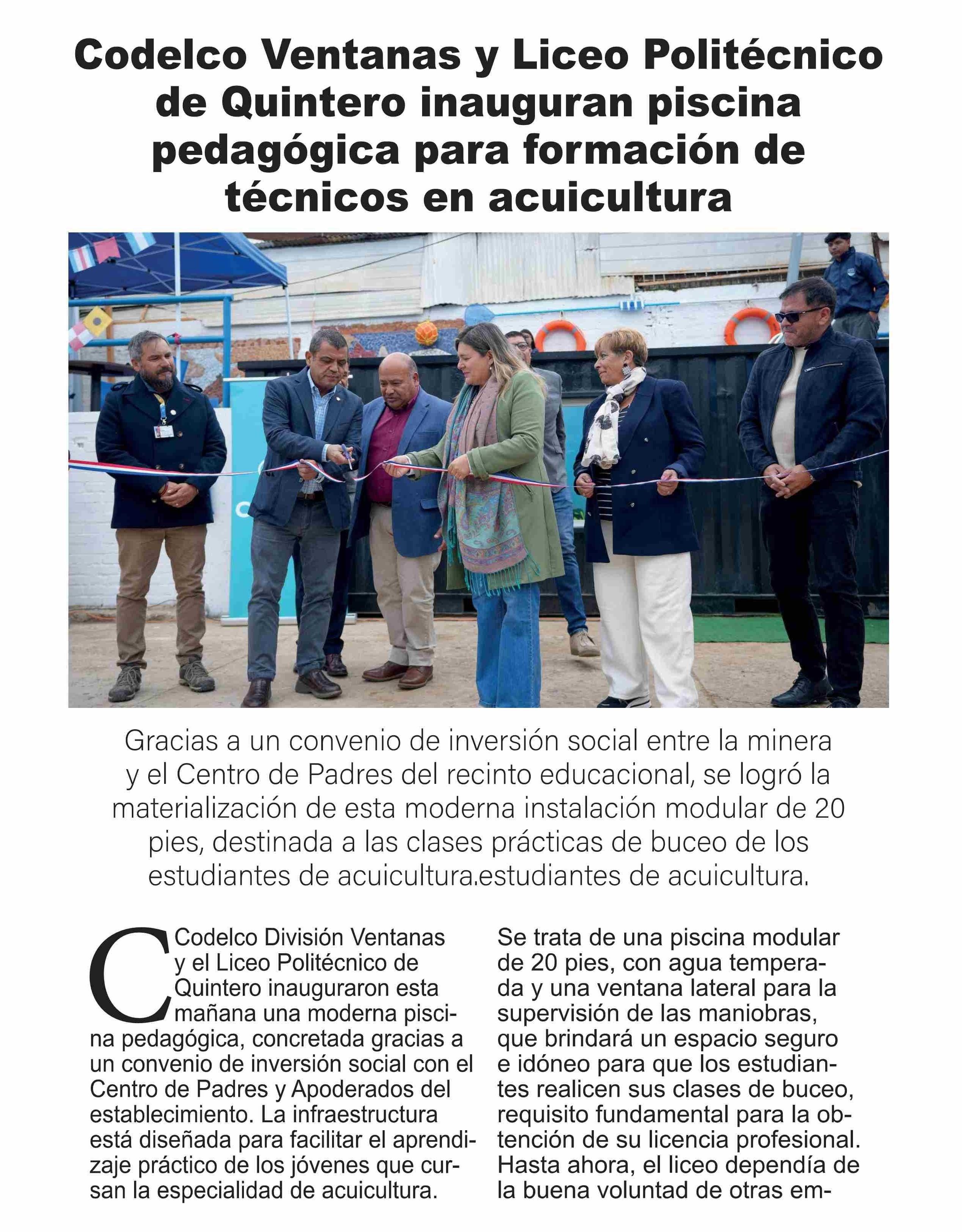 | Título: | Codelco Ventanas y Liceo Politécnico de Quintero inauguran piscina pedagógica para formación de técnicos en acuicultura |