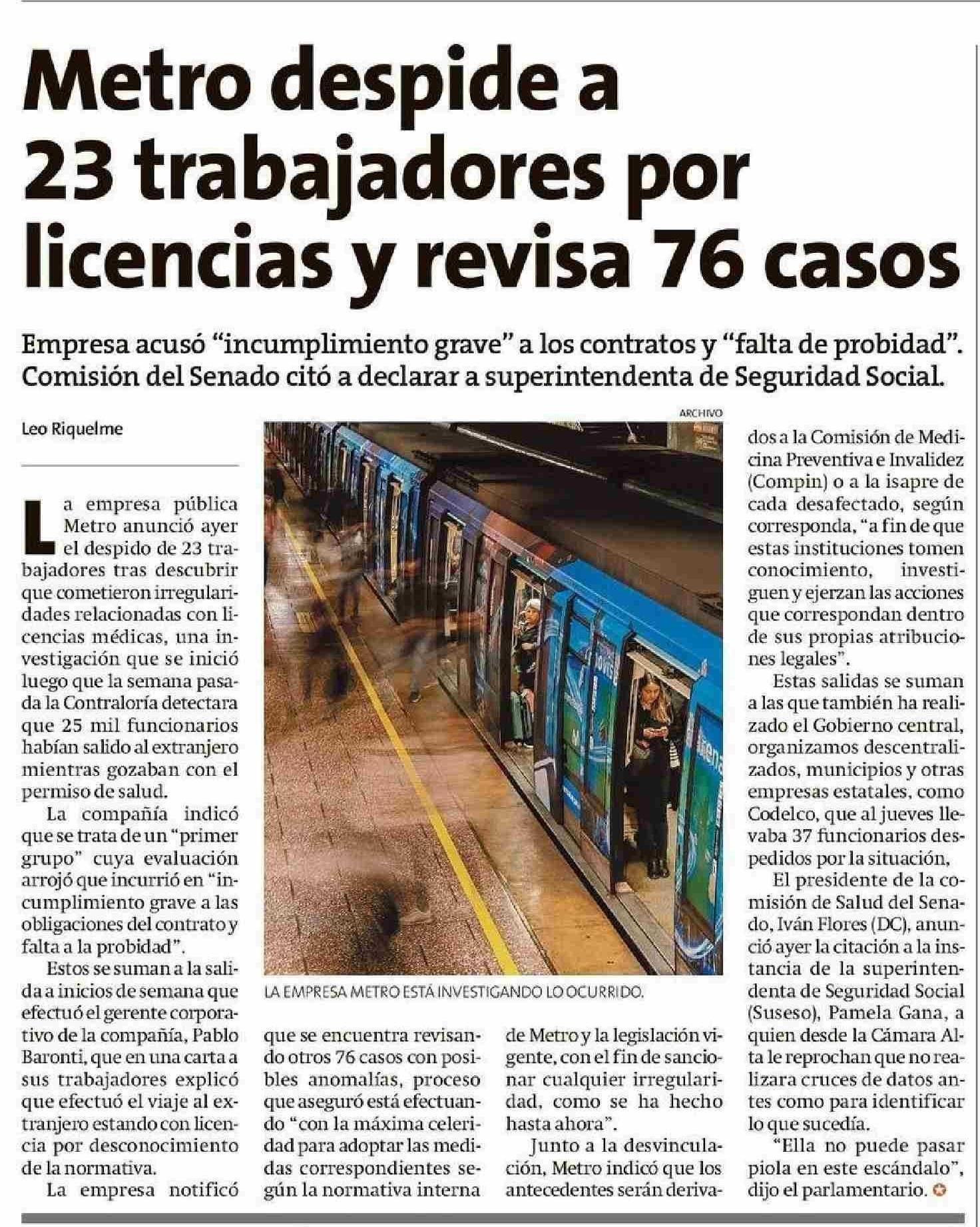 Título: Metro despide a 23 trabajadores por licencias y revisa 76 casos
