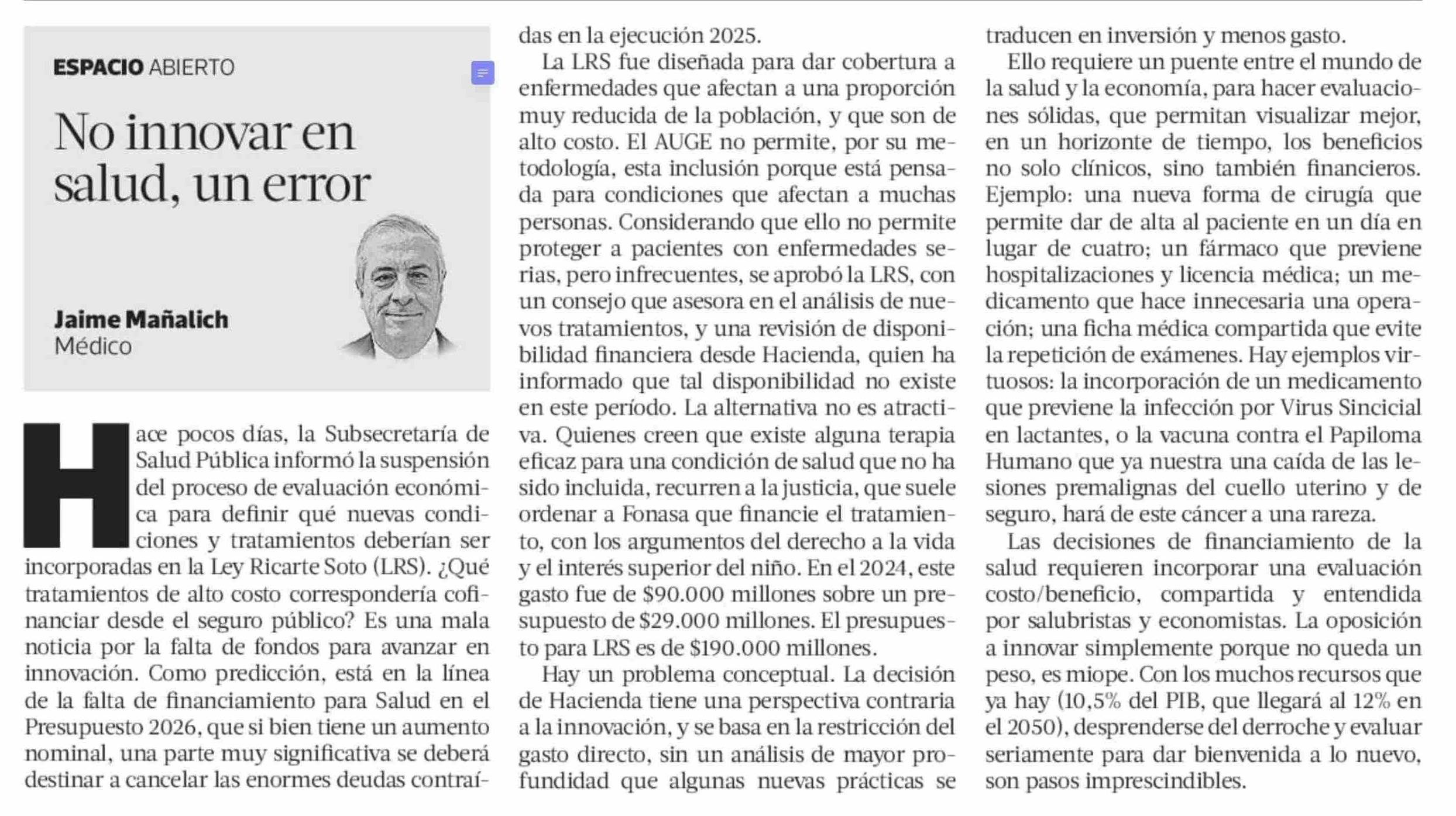 Columnas de Opinión: No innovar en salud, un error
