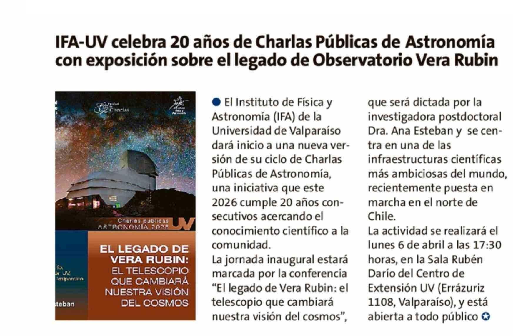 IFA-UV celebra 20 años de Charlas Públicas de Astronomía con exposición sobre el legado de Observatorio Vera Rubin