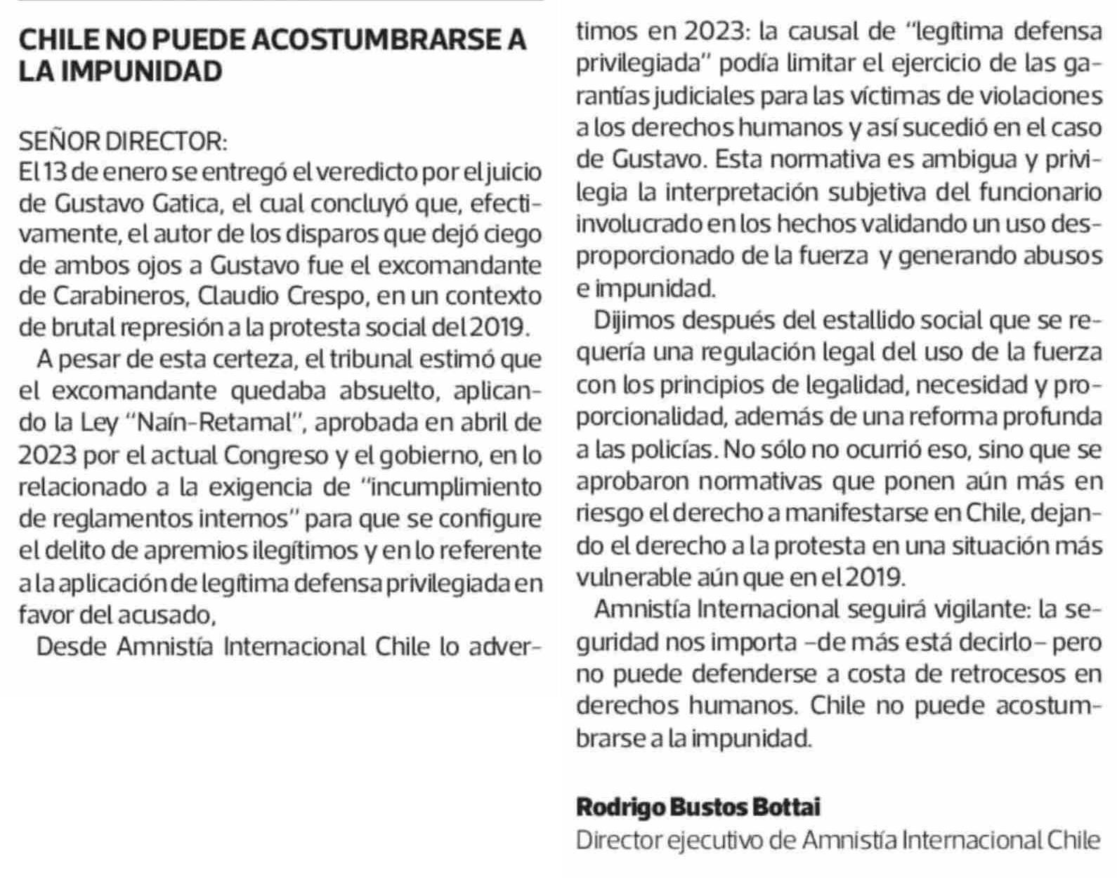 Cartas: CHILE NO PUEDE ACOSTUMBRARSE A LA IMPUNIDAD