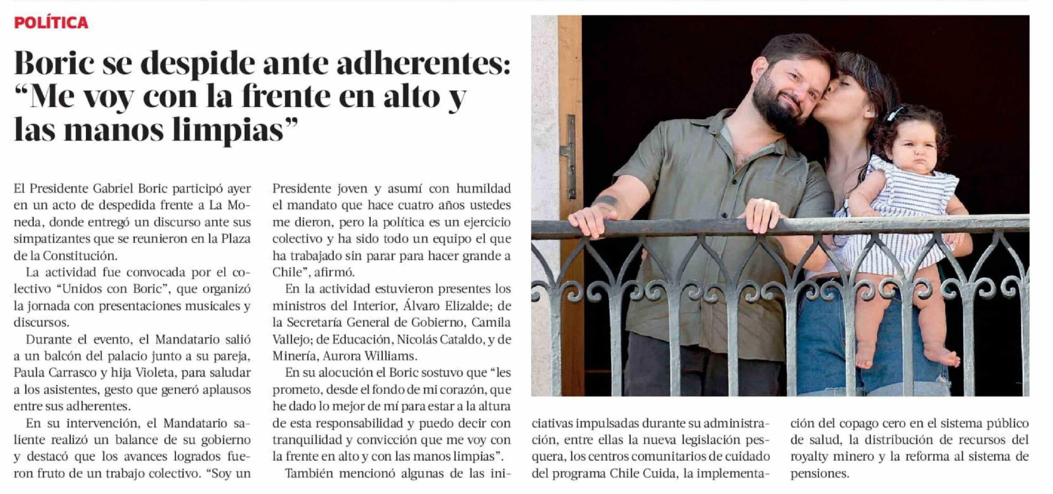 Boric se despide ante adherentes: "Me voy con la frente en alto y las manos limpias"