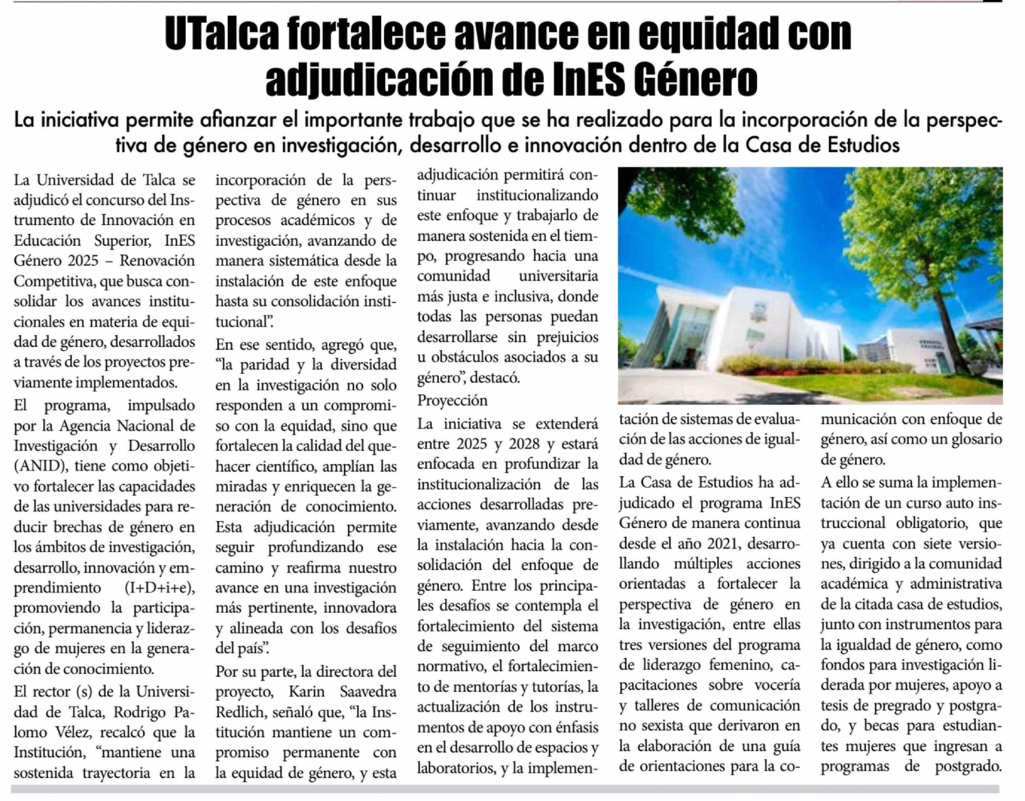 UTalca fortalece avance en equidad con adjudicación de InES Género