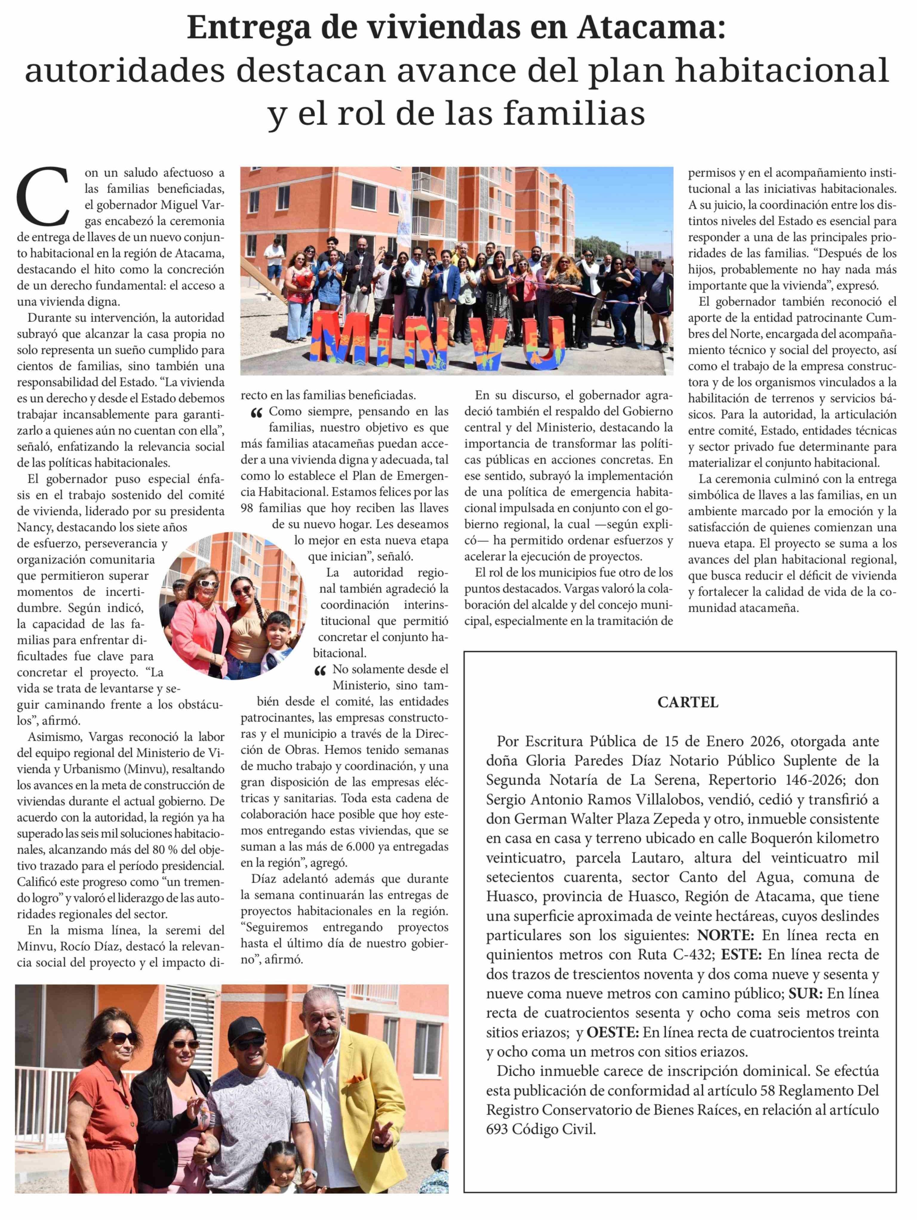 Entrega de viviendas en Atacama: autoridades destacan avance del plan habitacional y el rol de las familias