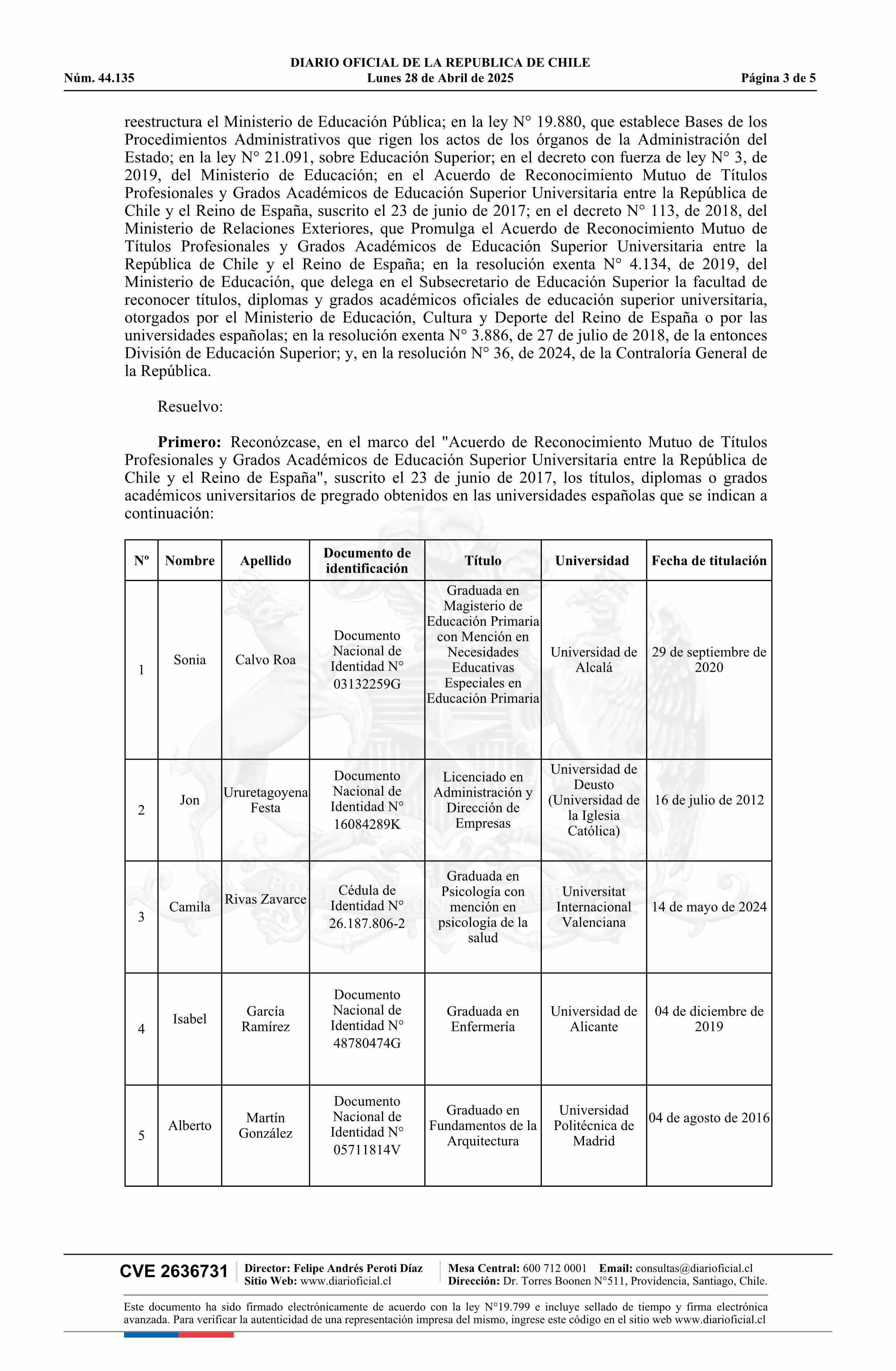 | Título: | Resolución exenta número 2.482, de 2025.- Reconoce títulos expedidos por universidades españolas que indica, en el marco del Acuerdo de Reconocimiento Mutuo de Títulos Profesionales y Grados Académicos de Educación Superior Universitaria entre la República de Chile y el Reino de España |