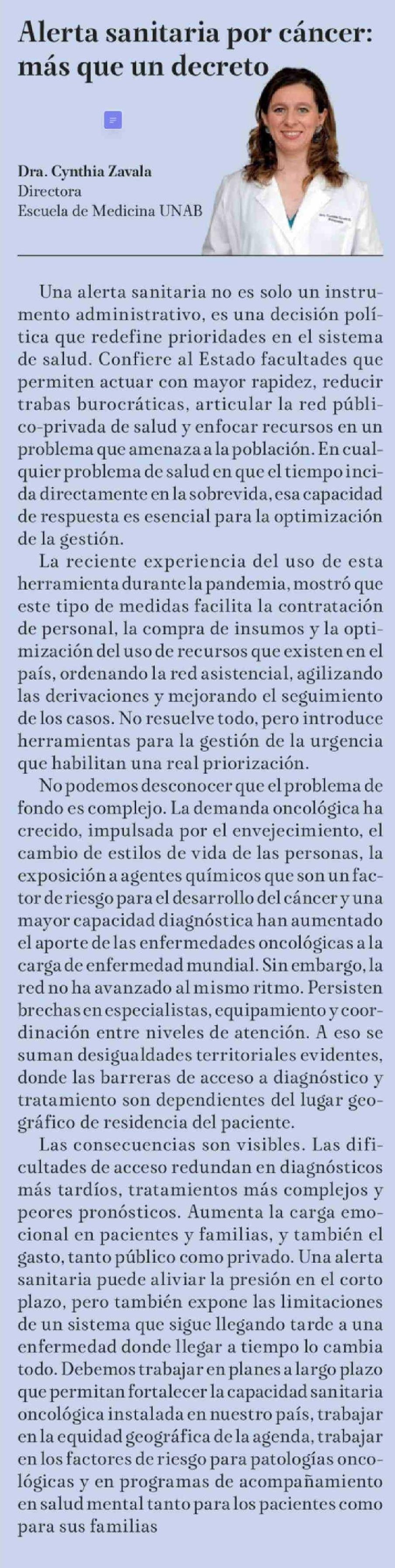 Título: Columnas de Opinión: Alerta sanitaria por cáncer: más que un decreto