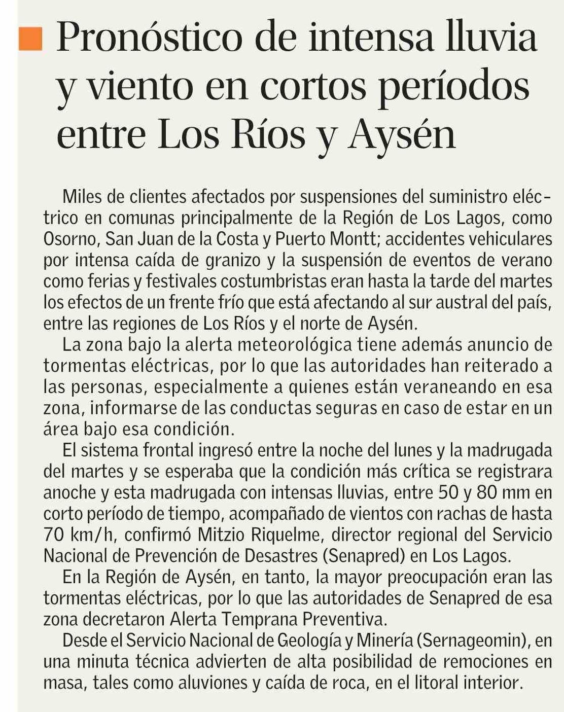 N Pronóstico de intensa lluvia y viento en cortos períodos entre Los Ríos y Aysén